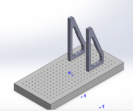 - 将“光学面包板尺寸=300×600mm厚度=50mm”水平放置,两个“垂直支撑架高度=300mm”竖直平行放置在上面,相距6个孔位间距,用M6螺丝固定,如下图。再将“铝板尺寸=200×200mm厚度=13mm”安装到垂直支撑架上。