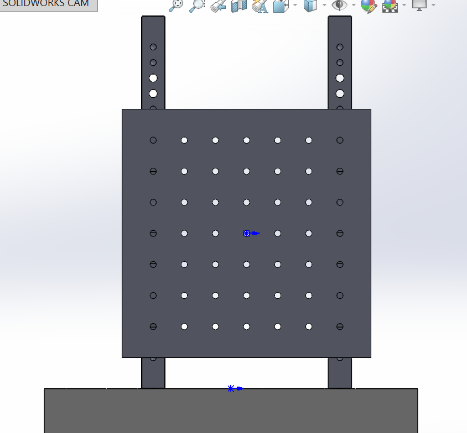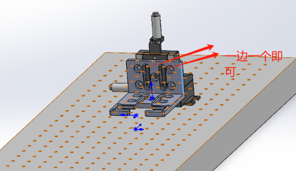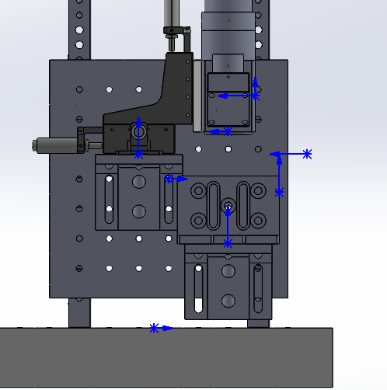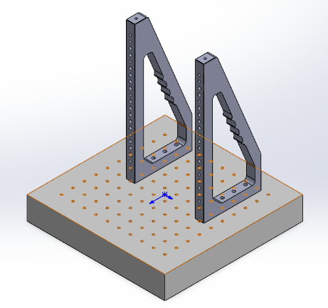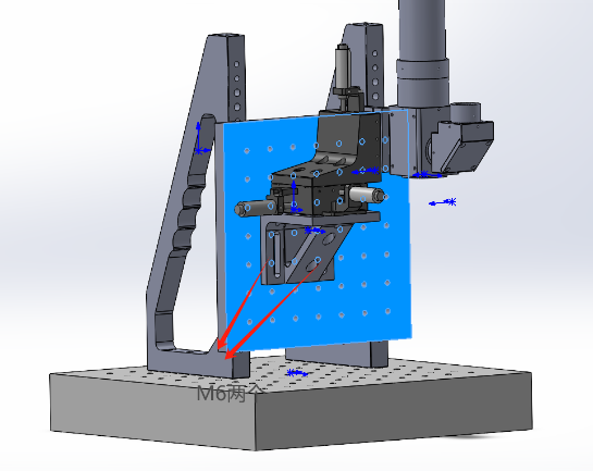 - 将“光学面包板尺寸=300×300mm厚度=50mm”水平放置,两个“垂直支撑架高度=300mm”竖直平行放置在上面,相距6个孔位间距,用M6螺丝固定,如下图。再将“铝板尺寸=200×200mm厚度=13mm”安装到垂直支撑架上。