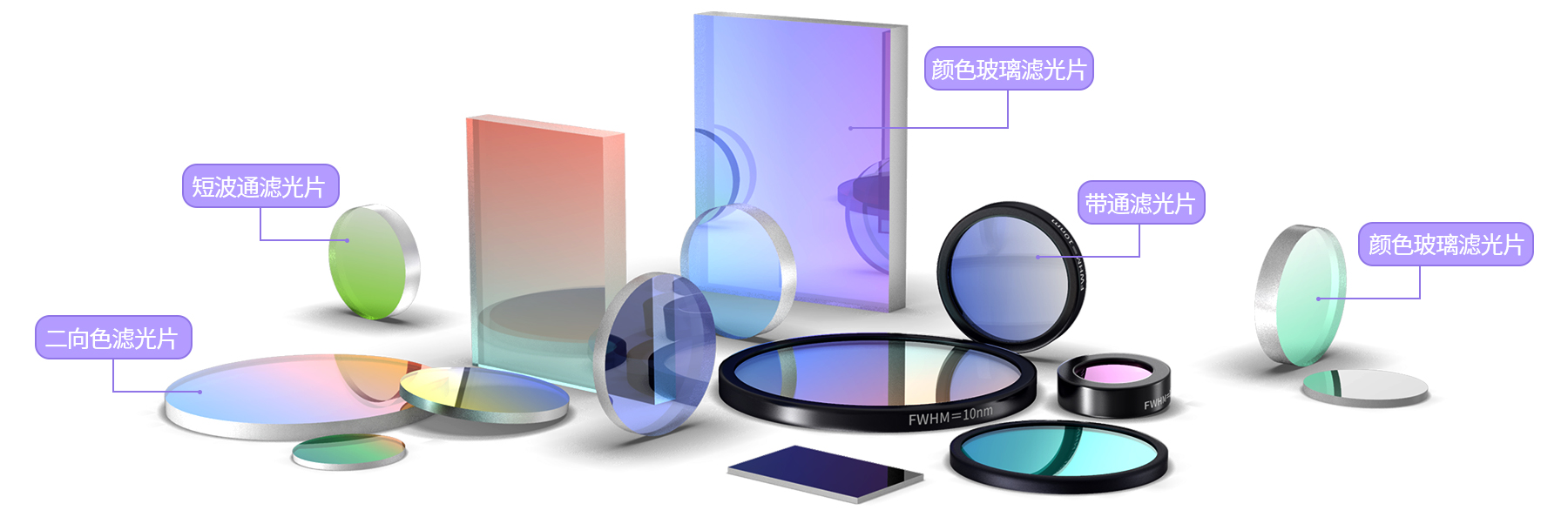 按照其功能作用可分为带通滤光片、长波通滤光片、短波通滤光片、二向色滤光片、中性密度片(ND Filter)、陷波滤光片、冷反射镜、热反射镜、颜色滤光片等。按加工工艺,分为干涉滤光片和颜色吸收滤光片。这些滤光片被广泛地应用于光谱分析、生物医学、机器视觉、荧光显微、工业自动化等行业及产品领域。带通滤光片在其光谱范围内有选择性的允许某光谱波长透过和阻止某光谱波长透过;中性密度滤光片(ND Filter)通过降低指定光谱波长范围的透过率,从而减少光通量,这样有利于对传感器/电子元件的保护,其在激光光学领域/光电子领域有广泛应用;冷/热反射镜可有针对性的反射和透射光谱范围中波长较长的光,被广泛应用在照明系统中,有利于排除照明系统中产生的热量。