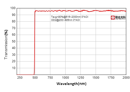 联合光科提供的长波通滤光片,具有截止带宽宽,截止深度深,转换陡度高,透过率高等优点。可广泛应用于荧光激发光谱测量,拉曼光谱应用,光谱分组应用,及天文观测应用等,还可广泛用于成像光学系统,机器视觉系统应用,用来剔除可用波段以外的干扰光,提高成像清晰度,以及系统的灵敏度。