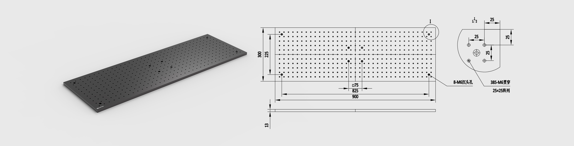 1. 台面阵列的标准M6/孔距25*25mm螺纹孔便于固定各种调整架;