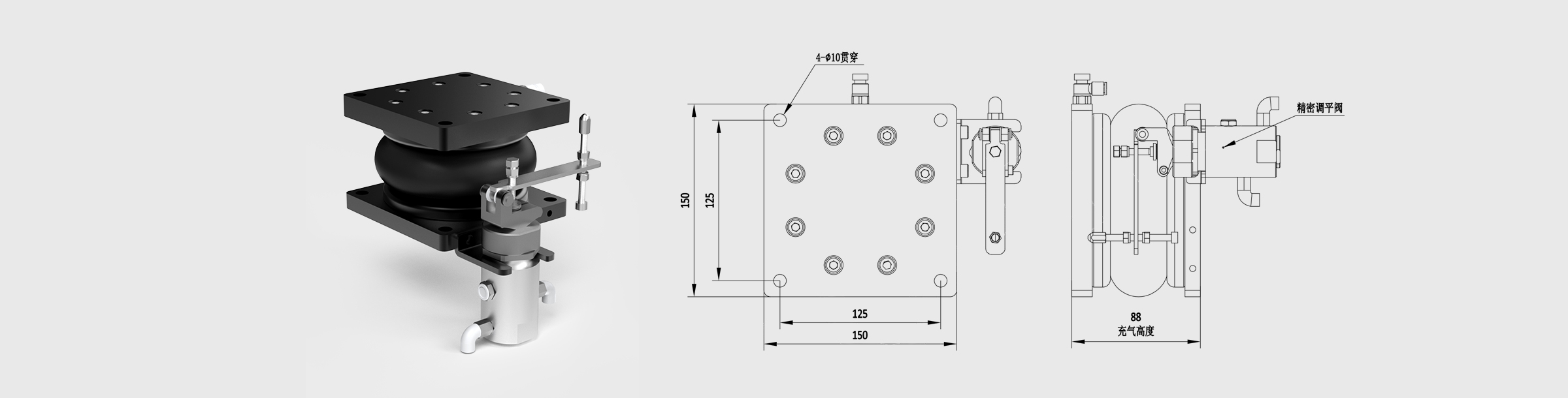 气囊型减振器使用耐用性极强的气囊型空气弹簧,使用寿命长,重量轻。减振器上安置精密(土0.05mm)调平阀可实现较高的重复性精密,缩短设备的稳定时间,保证平台的水平性。内置型油阻尼, 搭载运动平台的设备稳定时间即可缩短,减振器刚性。使用提升气囊型空气弹簧,以科学合理的结构设计使其在垂直和水平方向实现基本的减振性能。
