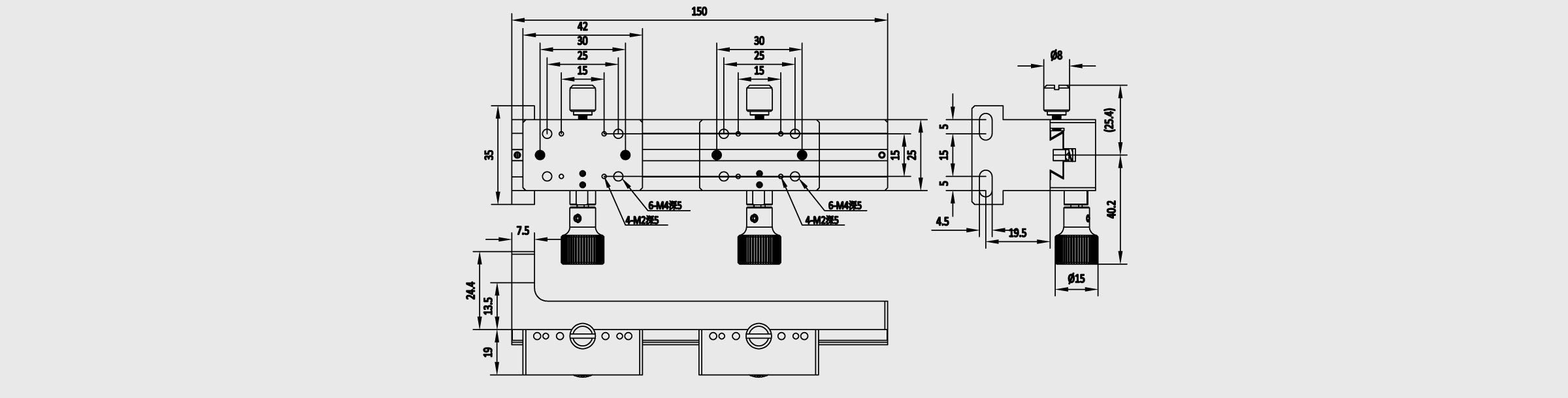 *单轴-Z轴 *台面尺寸: 25x42mm、40x40mm、60x60mm *长度:50~500mm *行程:30~460mm *旋钮回转一圈移动量18mm *标尺刻度最小读取量0.1mm *轨道方式使用燕尾槽式,在构造上燕尾槽导轨和滑块组成面接触方式进行直线运动, 提供稳定的导向,及耐荷重的表现 *驱动方式:齿轮齿条,适合快速移动 *主体材质-铝合金(黑色阳极氧化) *产品可选两个滑块,行程会减少相应滑块长度,滑块总长度不大能大于自身行程。