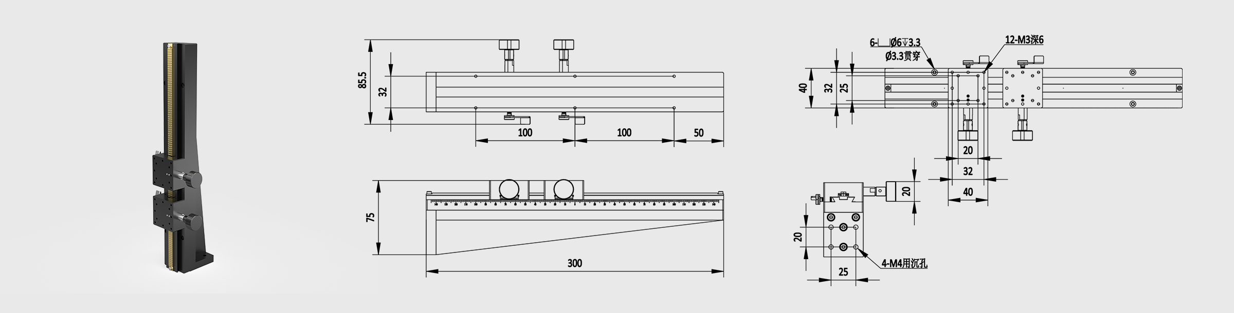 *单轴-Z轴 *台面尺寸: 25x42mm、40x40mm、60x60mm *长度:50~500mm *行程:30~460mm *旋钮回转一圈移动量18mm *标尺刻度最小读取量0.1mm *轨道方式使用燕尾槽式,在构造上燕尾槽导轨和滑块组成面接触方式进行直线运动, 提供稳定的导向,及耐荷重的表现 *驱动方式:齿轮齿条,适合快速移动 *主体材质-铝合金(黑色阳极氧化) *产品可选两个滑块,行程会减少相应滑块长度,滑块总长度不大能大于自身行程。