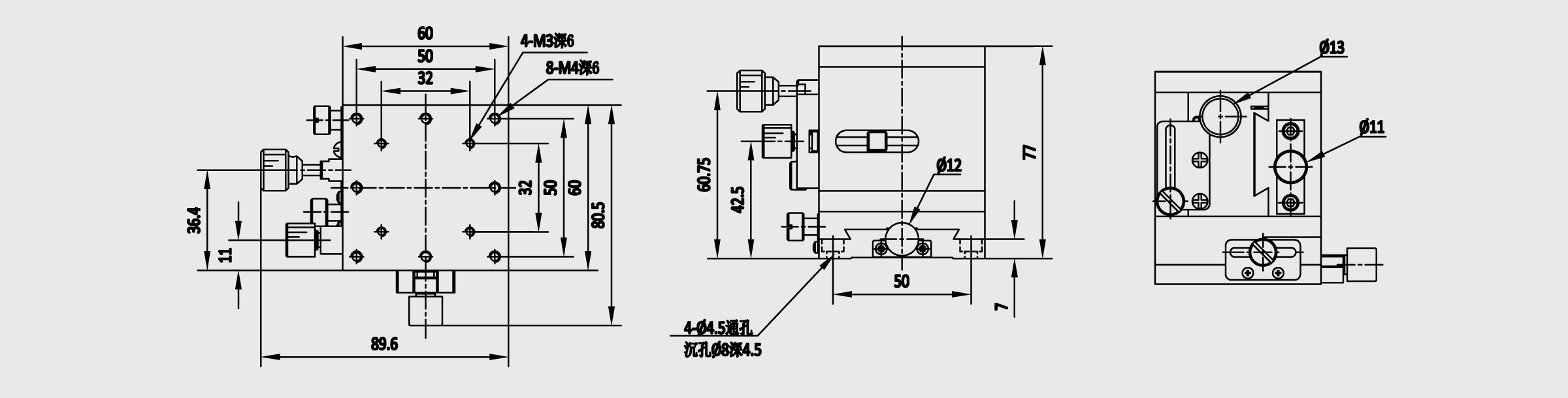 *三轴-XY水平Z轴 *XY轴丝杆旋钮回转一圈移动量0.5mm *Z轴丝杆旋钮回转一圈移动量14、14、20mm *轨道方式使用燕尾槽式,在构造上燕尾槽导轨和滑块组成面接触方式进行直线运动, 提供稳定的导向 *驱动方式:XY轴进给丝杆,水平Z轴齿轮齿条 *主体材质-铜合金(黑色氟树脂)/ 铝合金(黑色阳极氧化)