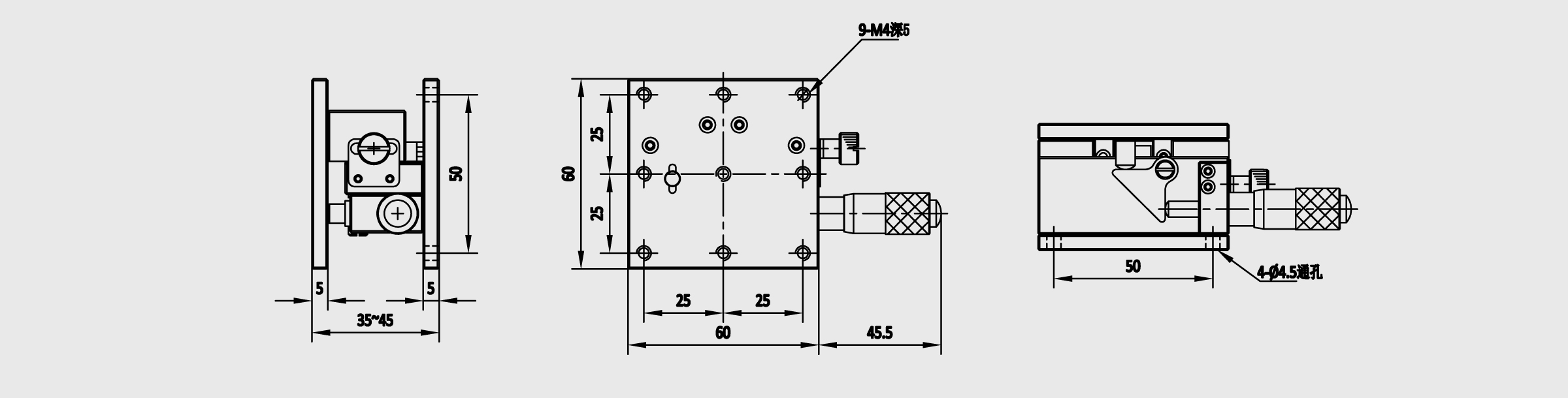 *单轴-水平Z轴 *轨道方式使用交叉滚柱导轨 *驱动方式:千分尺,最小读取量10μm *主体材质-铝合金(黑色阳极氧化) *耐负载大、刚性最强 *V型槽在热处理和精密研磨加工后,得到优异的平行度、平面度;滚子经过近似镜面的精密研磨后得以圆滑的滚动,直径的均一性非常优秀,可以对滑台进行精密的导向