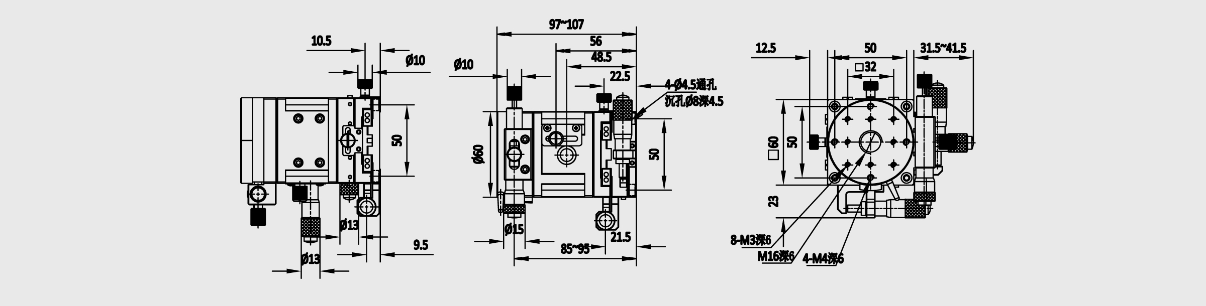 *四轴-XYZθ轴 *轨道方式使用交叉滚柱导轨 *驱动方式:千分尺,最小读取量10μm *X轴行程±6.5mm,Y轴行程±6.5mm,Z轴行程0~10mm;θ轴粗调360°微调±5° *主体材质-铝合金(黑色阳极氧化) *耐负载大、刚性最强 *V型槽在热处理和精密研磨加工后,得到优异的平行度、平面度;滚子经过近似镜面的精密研磨后得以圆滑的滚动,直径的均一性非常优秀,可以对滑台进行精密的导向