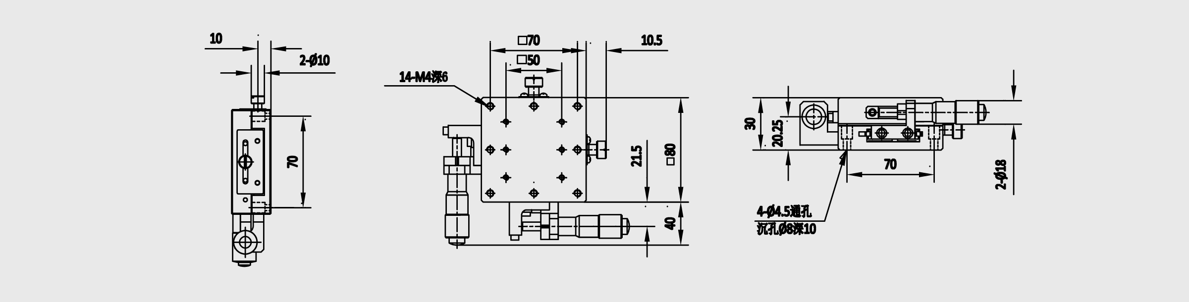 *双轴-XY轴 *轨道方式使用线性滚珠导轨 *驱动方式:千分尺进给 *千分尺最小读取量10μm *主体材质-铝合金(黑色阳极氧化) *导轨面经过硬化,并施以高精度切削研磨加工,得到优异的平行度、平面度 *适用于高精度,中载荷的精密位置调节的场合