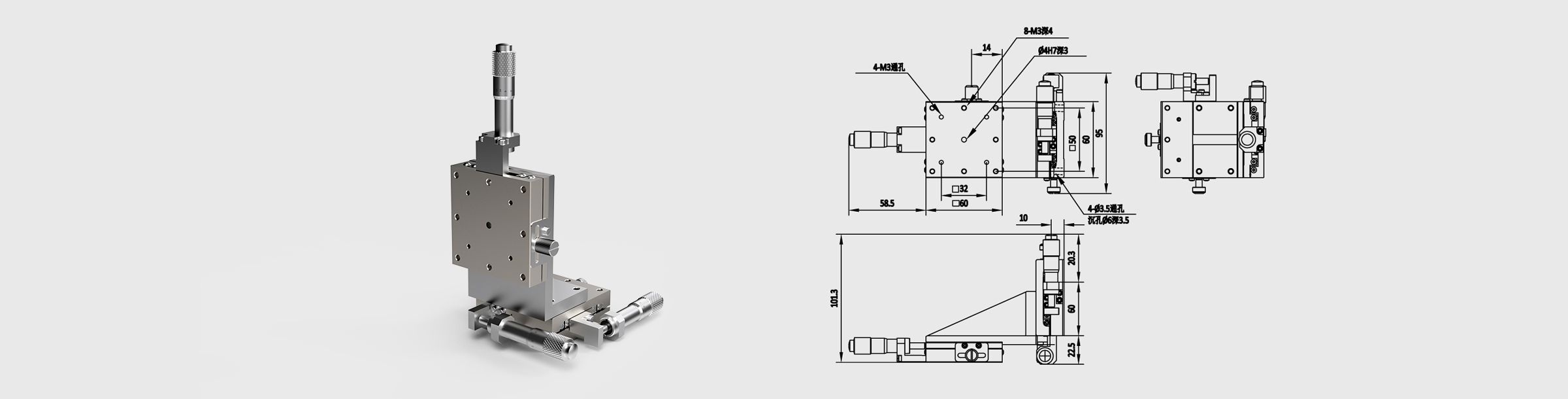 *三轴-XYZ轴 *轨道方式使用线性滚珠导轨 *驱动方式:千分尺进给 *千分尺最小读取量10μm *主体材质-SUS440C(无电解镀镍) *导轨面经过硬化,并施以高精度切削研磨加工,得到优异的平行度、平面度 *适用于高精度,中载荷的精密位置调节的场合