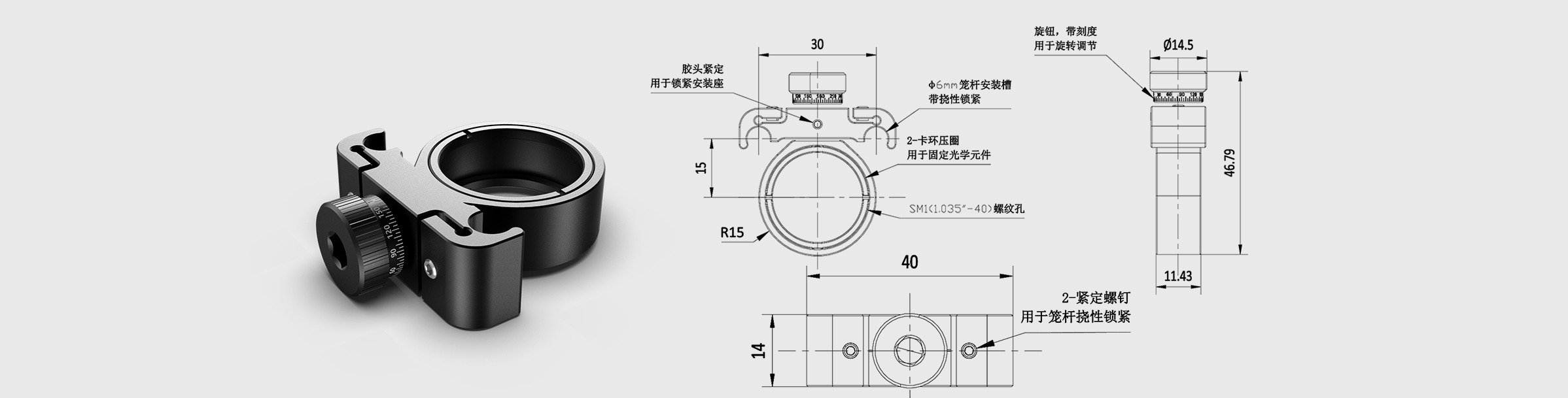 5. 530027光学元件固定方式:顶丝,适用安装Φ25.4mm,最小厚度为3mm的光学元件;