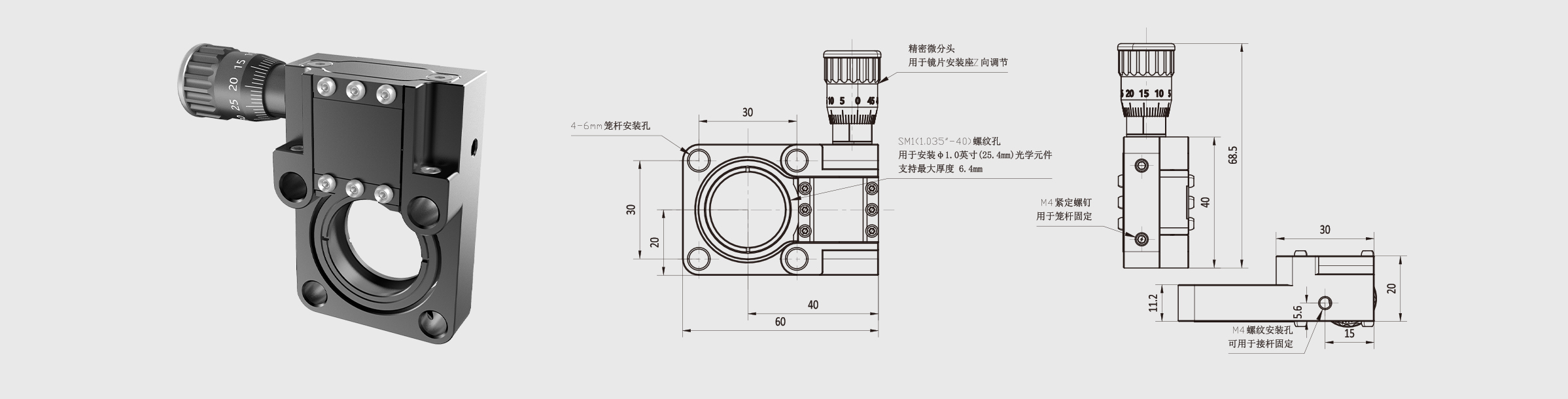 3. 可安装最大厚度为6.4mm的Φ1英寸光学元件;