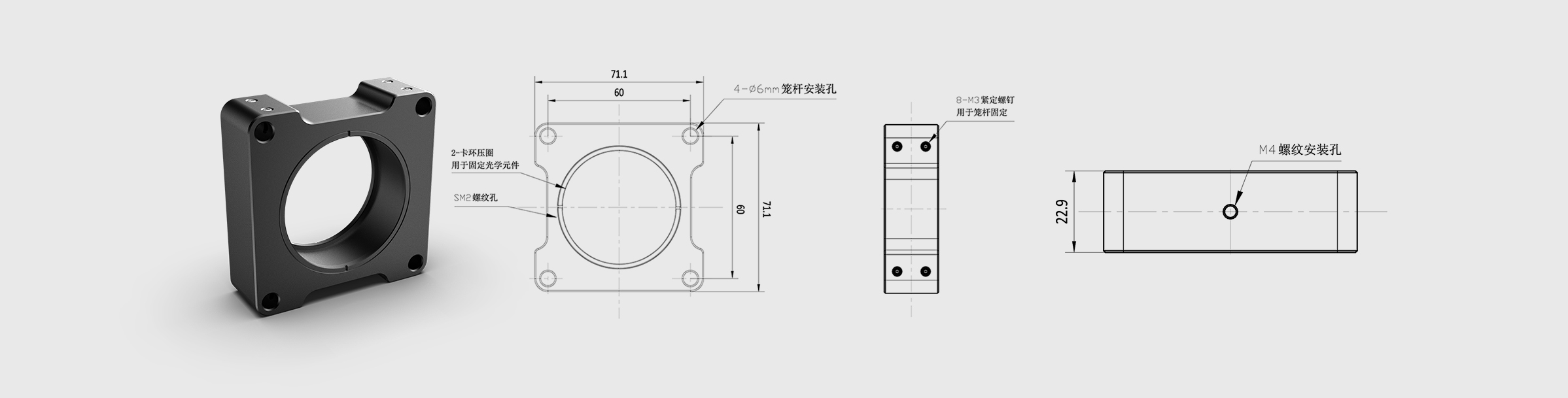 2. 光学元件固定方式:附带2个SM2压圈(530083);