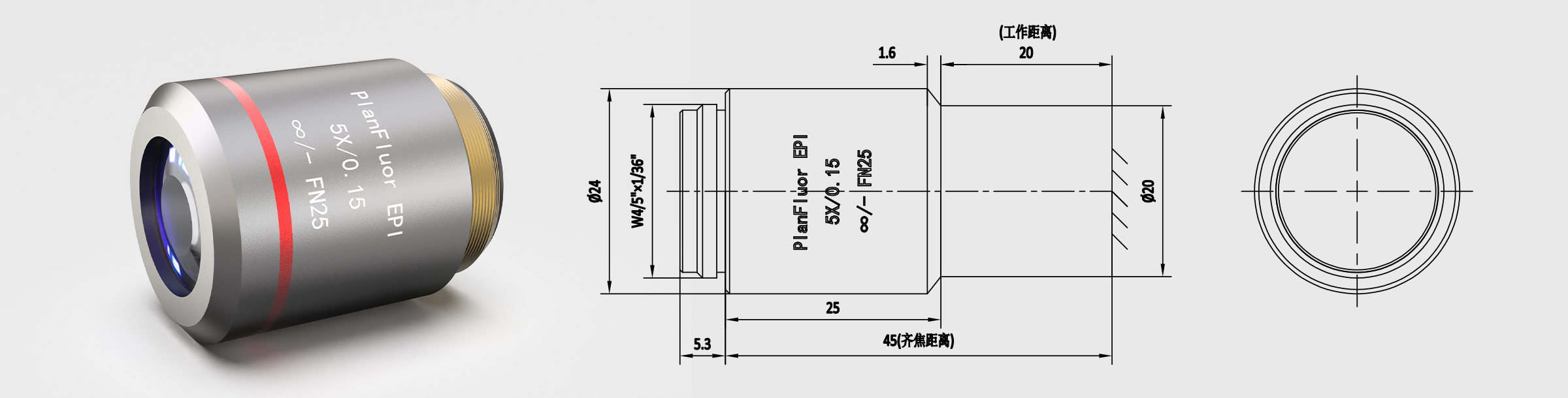 齐焦45mm 明场半复消色差物镜 5X