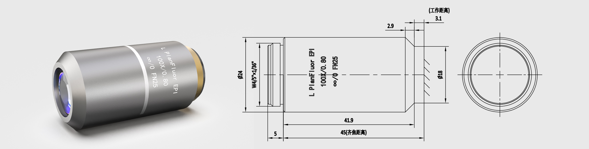 齐焦45mm 长工作距离明场半复消色差物镜 100X