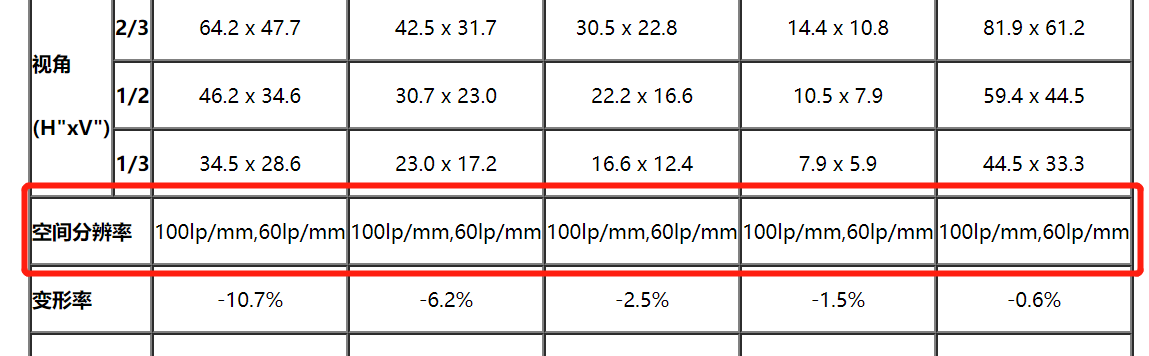 二、数据资料 数据资料即量化的参数,即工业镜头的线对数或匹配的像元尺寸。如3.45μm,2.4μm,8K7μ,16K5μ,100lp/mm,200lp/mm等。 其优点是提供了量化的数据。如2.4μm,表明镜头匹配2.4μm的像元尺寸;100lp/mm,则表明镜头分辨率达到100lp/mm。工程师可以非常清晰了解镜头的分辨率性能。 其缺点是数据比较片面。工业镜头中心的分辨率一般比边缘的高,如果只有一个参数,工程师没办法判断其他成像面的分辨率。针对不同像面时,需要额外手段测量镜头的分辨率。