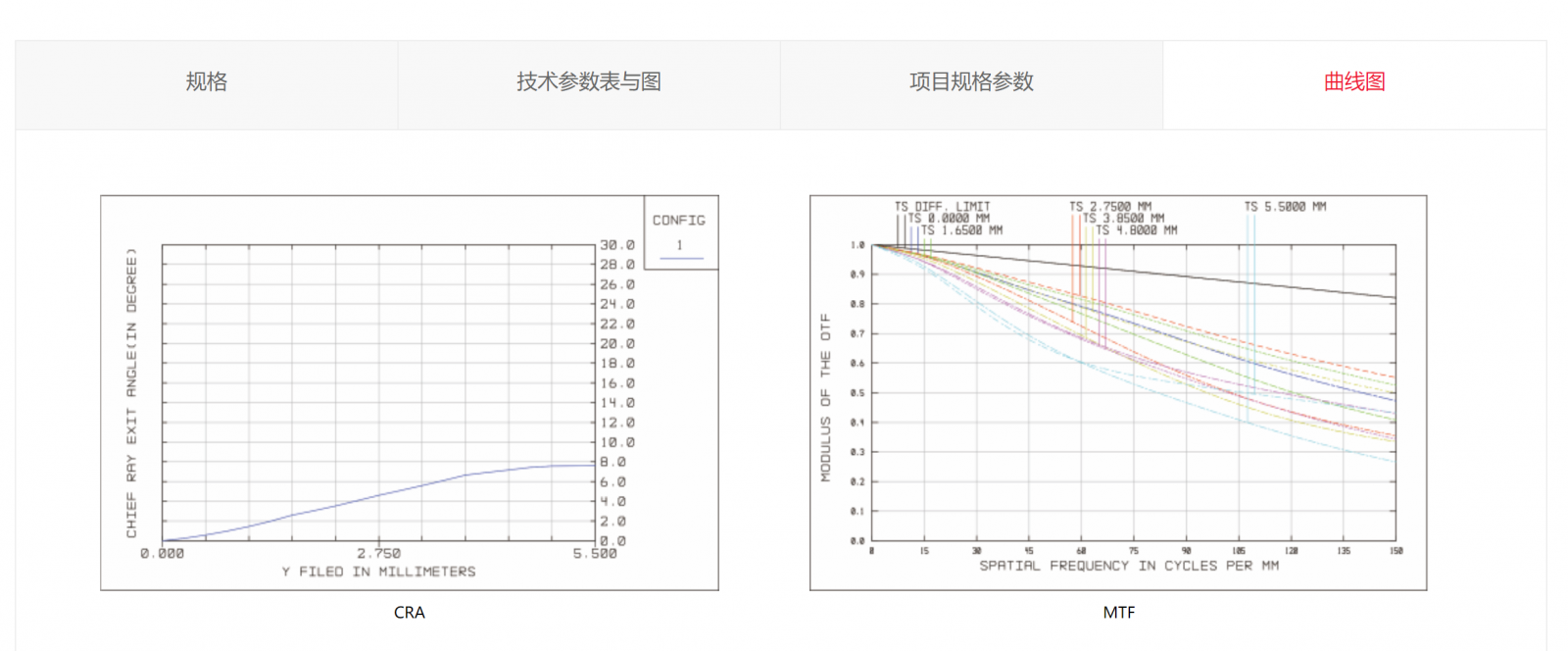 四、图表资料 图表资料主要的形式为MTF成像曲线图。 MTF 成像曲线图是在客观的测试环境下测得并对外公布的,是镜头成像品质相对权威、相对客观的技术参考依据。 同时此类资料涉及一些抽象的概念,理解需要一定的光学基础。