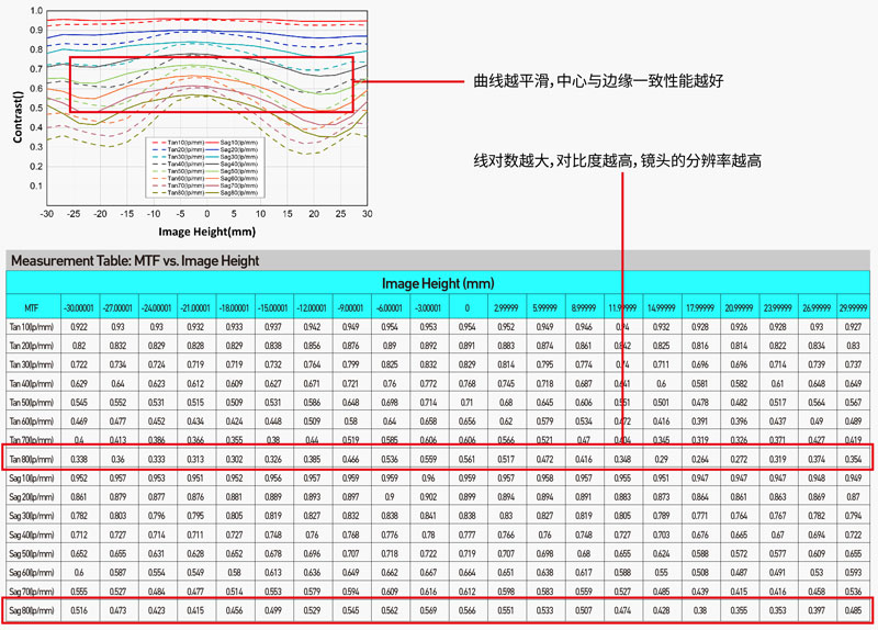 1. 对数越大,对比度越高,镜头的分辨率越高。 2. 曲线越平滑,中心与边缘一致性越好。 |