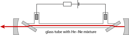 图1:氦氖激光器示意图。玻璃窗口在谐振腔中,方向调节为布儒斯特角,对p偏振光产生的损耗很小。