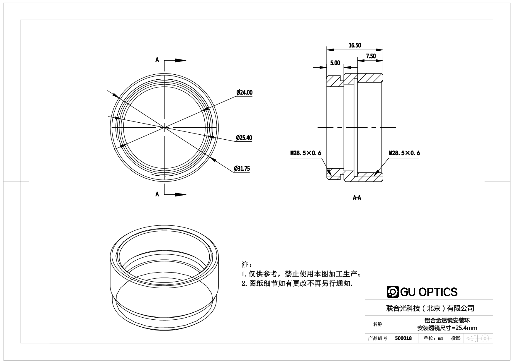 联合光科提供多种尺寸的透镜安装环(Optical Lens Mounts),适用于不同尺寸和厚度的单透镜及胶合透镜的安装固定,可以让客户将光学透镜方便地接入光路系统中。透镜安装环的长度范围8.5mm-27.5mm,安装透镜的直径范围4mm-50.8mm,可以安装平凸透镜、双凸透镜、平凹透镜、双凹透镜等单透镜,也可以安装正胶合消色差透镜及负胶合消色差透镜等胶合透镜。透镜安装环标配一个与安装环的螺纹配套的标准压圈,用于将透镜固定在透镜安装环中。