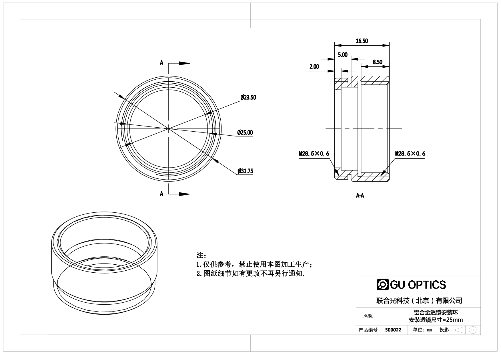 联合光科提供多种尺寸的透镜安装环(Optical Lens Mounts),适用于不同尺寸和厚度的单透镜及胶合透镜的安装固定,可以让客户将光学透镜方便地接入光路系统中。透镜安装环的长度范围8.5mm-27.5mm,安装透镜的直径范围4mm-50.8mm,可以安装平凸透镜、双凸透镜、平凹透镜、双凹透镜等单透镜,也可以安装正胶合消色差透镜及负胶合消色差透镜等胶合透镜。透镜安装环标配一个与安装环的螺纹配套的标准压圈,用于将透镜固定在透镜安装环中。