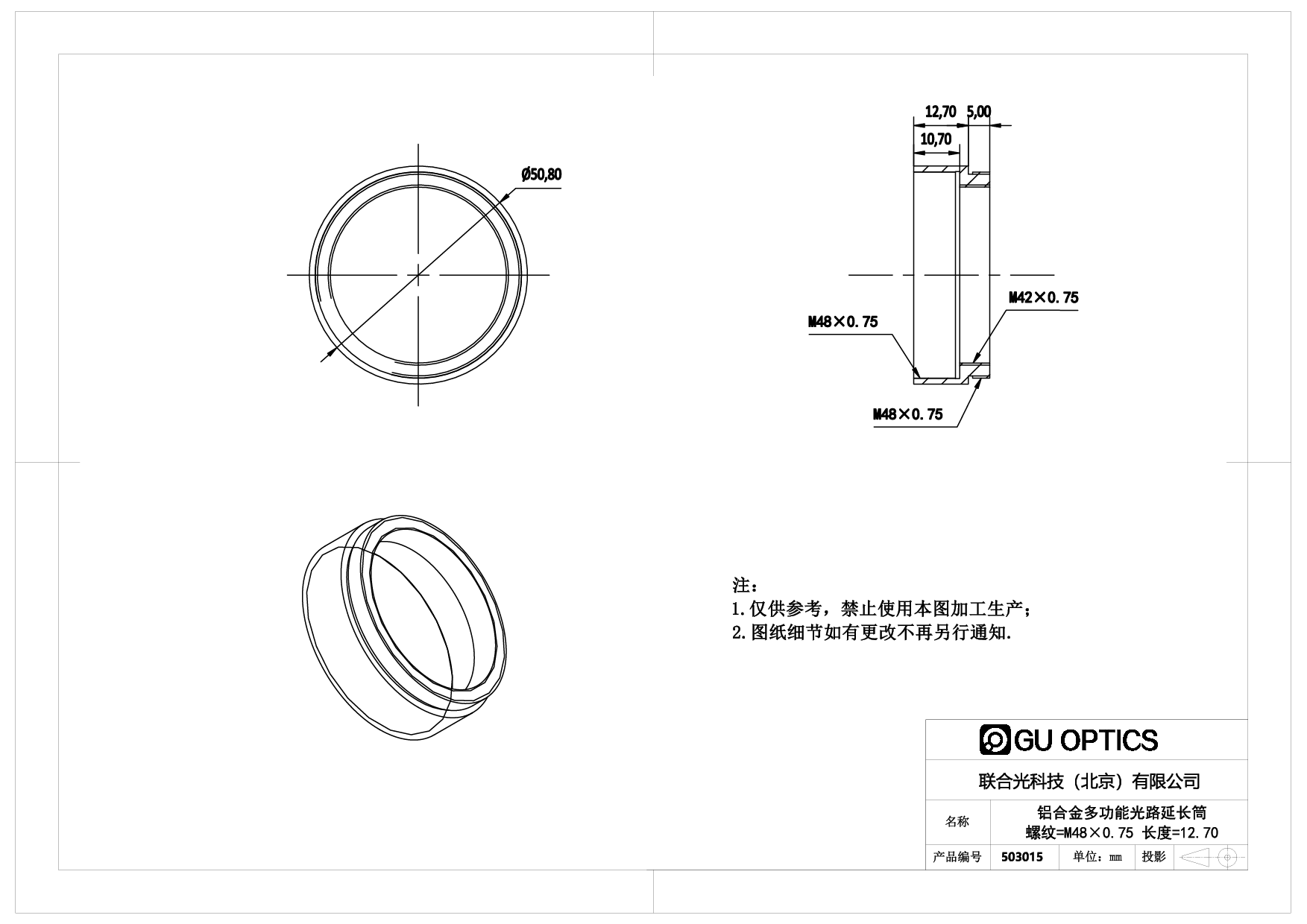 多功能光路延长筒(Multi Purpose Extension Tube)用于光路中,可以方便调整光学器件的空间间隔,配合调焦部件,更可以实现不同光学部件间隔的精密调整。联合光科技提供的多功能光路延长筒内部都有精密车制的标准螺纹,双端都有标准螺纹接口用于和光桥系统所有其他产品的互联。所有多功能光路延长筒内部都有精密车制的标准螺纹,同时双端都有标准螺纹接口用于和光桥系统所有其他产品的互连。 当多功能光路延长筒仅用于延长光路使用时,其内部精密螺纹结构起到消光作用,为光路中杂散光的消除提供了极大的帮助,同时也彻底排除了外界杂散光对光学系统的干扰。当多功能光路延长筒和安装压圈配合使用时,可以将各种标准口径的光学元件安装并固定在延长筒内部。这样为使用者提供了方便且经济的办法,用于镜头原型的设计及试验,或用于复杂光学系统的建立。