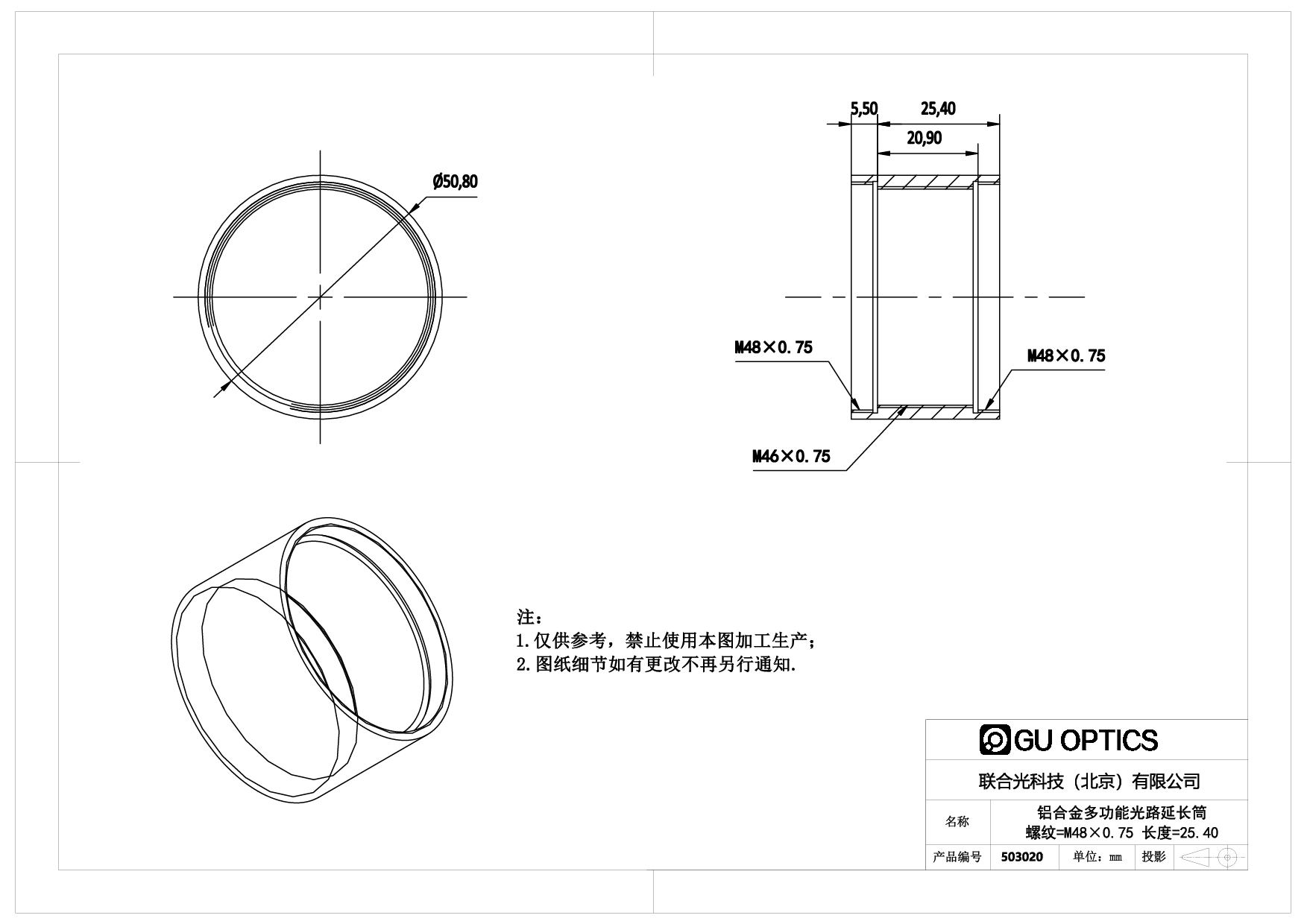 多功能光路延长筒(Multi Purpose Extension Tube)用于光路中,可以方便调整光学器件的空间间隔,配合调焦部件,更可以实现不同光学部件间隔的精密调整。联合光科技提供的多功能光路延长筒内部都有精密车制的标准螺纹,双端都有标准螺纹接口用于和光桥系统所有其他产品的互联。所有多功能光路延长筒内部都有精密车制的标准螺纹,同时双端都有标准螺纹接口用于和光桥系统所有其他产品的互连。 当多功能光路延长筒仅用于延长光路使用时,其内部精密螺纹结构起到消光作用,为光路中杂散光的消除提供了极大的帮助,同时也彻底排除了外界杂散光对光学系统的干扰。当多功能光路延长筒和安装压圈配合使用时,可以将各种标准口径的光学元件安装并固定在延长筒内部。这样为使用者提供了方便且经济的办法,用于镜头原型的设计及试验,或用于复杂光学系统的建立。