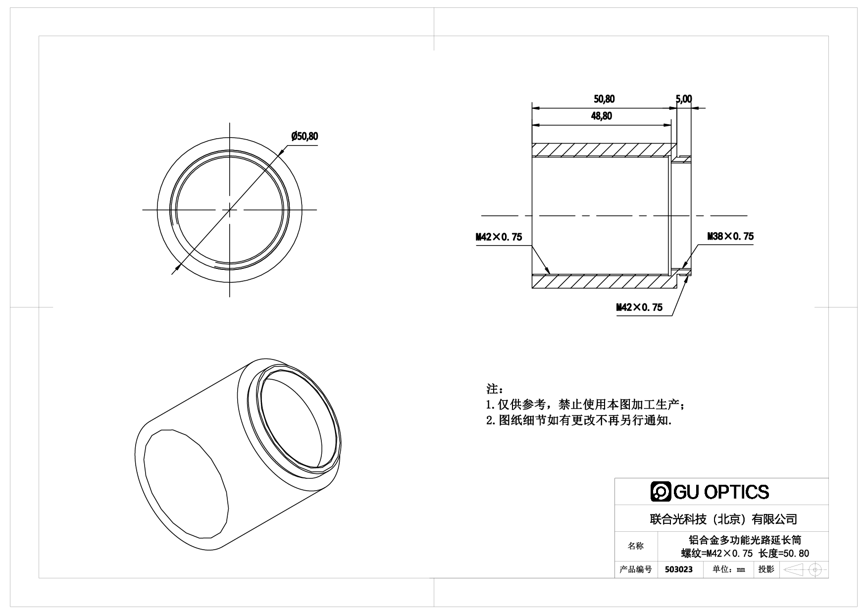 多功能光路延长筒(Multi Purpose Extension Tube)用于光路中,可以方便调整光学器件的空间间隔,配合调焦部件,更可以实现不同光学部件间隔的精密调整。联合光科技提供的多功能光路延长筒内部都有精密车制的标准螺纹,双端都有标准螺纹接口用于和光桥系统所有其他产品的互联。所有多功能光路延长筒内部都有精密车制的标准螺纹,同时双端都有标准螺纹接口用于和光桥系统所有其他产品的互连。 当多功能光路延长筒仅用于延长光路使用时,其内部精密螺纹结构起到消光作用,为光路中杂散光的消除提供了极大的帮助,同时也彻底排除了外界杂散光对光学系统的干扰。当多功能光路延长筒和安装压圈配合使用时,可以将各种标准口径的光学元件安装并固定在延长筒内部。这样为使用者提供了方便且经济的办法,用于镜头原型的设计及试验,或用于复杂光学系统的建立。