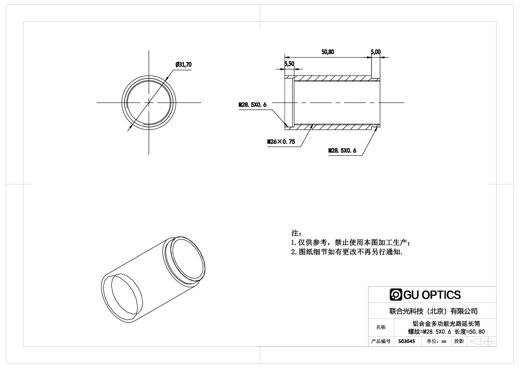 多功能光路延长筒(Multi Purpose Extension Tube)用于光路中,可以方便调整光学器件的空间间隔,配合调焦部件,更可以实现不同光学部件间隔的精密调整。联合光科技提供的多功能光路延长筒内部都有精密车制的标准螺纹,双端都有标准螺纹接口用于和光桥系统所有其他产品的互联。所有多功能光路延长筒内部都有精密车制的标准螺纹,同时双端都有标准螺纹接口用于和光桥系统所有其他产品的互连。 当多功能光路延长筒仅用于延长光路使用时,其内部精密螺纹结构起到消光作用,为光路中杂散光的消除提供了极大的帮助,同时也彻底排除了外界杂散光对光学系统的干扰。当多功能光路延长筒和安装压圈配合使用时,可以将各种标准口径的光学元件安装并固定在延长筒内部。这样为使用者提供了方便且经济的办法,用于镜头原型的设计及试验,或用于复杂光学系统的建立。