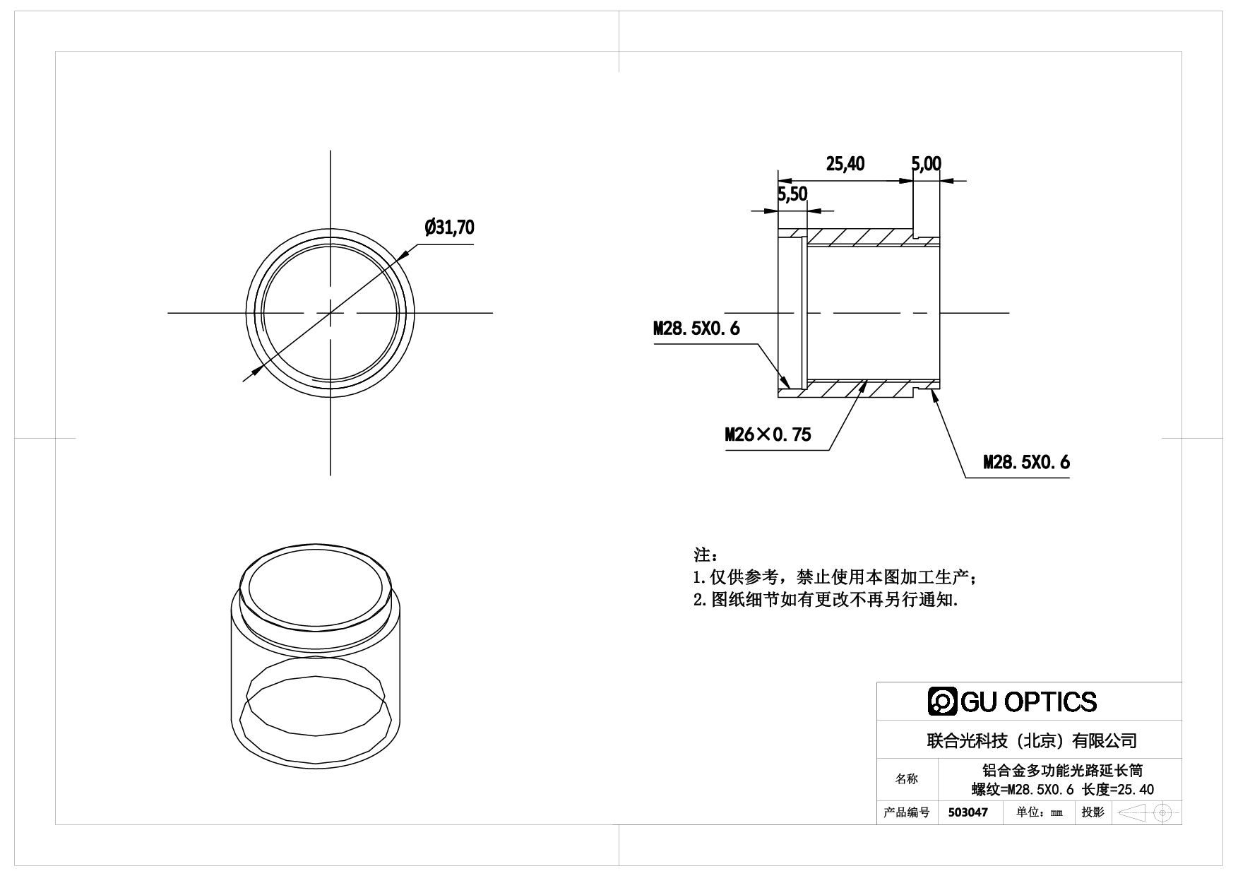 多功能光路延长筒(Multi Purpose Extension Tube)用于光路中,可以方便调整光学器件的空间间隔,配合调焦部件,更可以实现不同光学部件间隔的精密调整。联合光科技提供的多功能光路延长筒内部都有精密车制的标准螺纹,双端都有标准螺纹接口用于和光桥系统所有其他产品的互联。所有多功能光路延长筒内部都有精密车制的标准螺纹,同时双端都有标准螺纹接口用于和光桥系统所有其他产品的互连。 当多功能光路延长筒仅用于延长光路使用时,其内部精密螺纹结构起到消光作用,为光路中杂散光的消除提供了极大的帮助,同时也彻底排除了外界杂散光对光学系统的干扰。当多功能光路延长筒和安装压圈配合使用时,可以将各种标准口径的光学元件安装并固定在延长筒内部。这样为使用者提供了方便且经济的办法,用于镜头原型的设计及试验,或用于复杂光学系统的建立。
