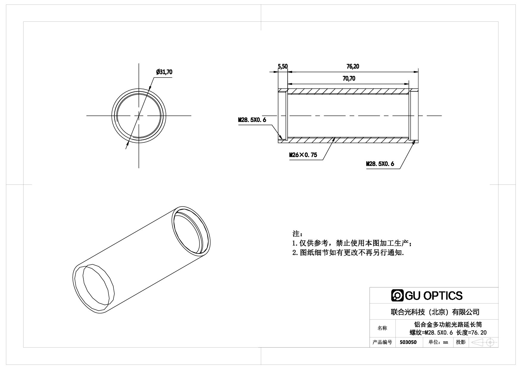 多功能光路延长筒(Multi Purpose Extension Tube)用于光路中,可以方便调整光学器件的空间间隔,配合调焦部件,更可以实现不同光学部件间隔的精密调整。联合光科技提供的多功能光路延长筒内部都有精密车制的标准螺纹,双端都有标准螺纹接口用于和光桥系统所有其他产品的互联。所有多功能光路延长筒内部都有精密车制的标准螺纹,同时双端都有标准螺纹接口用于和光桥系统所有其他产品的互连。 当多功能光路延长筒仅用于延长光路使用时,其内部精密螺纹结构起到消光作用,为光路中杂散光的消除提供了极大的帮助,同时也彻底排除了外界杂散光对光学系统的干扰。当多功能光路延长筒和安装压圈配合使用时,可以将各种标准口径的光学元件安装并固定在延长筒内部。这样为使用者提供了方便且经济的办法,用于镜头原型的设计及试验,或用于复杂光学系统的建立。