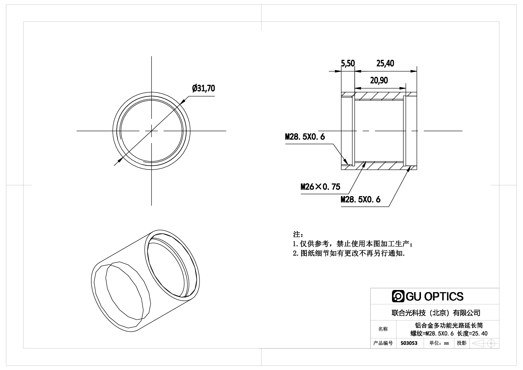 多功能光路延长筒(Multi Purpose Extension Tube)用于光路中,可以方便调整光学器件的空间间隔,配合调焦部件,更可以实现不同光学部件间隔的精密调整。联合光科技提供的多功能光路延长筒内部都有精密车制的标准螺纹,双端都有标准螺纹接口用于和光桥系统所有其他产品的互联。所有多功能光路延长筒内部都有精密车制的标准螺纹,同时双端都有标准螺纹接口用于和光桥系统所有其他产品的互连。 当多功能光路延长筒仅用于延长光路使用时,其内部精密螺纹结构起到消光作用,为光路中杂散光的消除提供了极大的帮助,同时也彻底排除了外界杂散光对光学系统的干扰。当多功能光路延长筒和安装压圈配合使用时,可以将各种标准口径的光学元件安装并固定在延长筒内部。这样为使用者提供了方便且经济的办法,用于镜头原型的设计及试验,或用于复杂光学系统的建立。