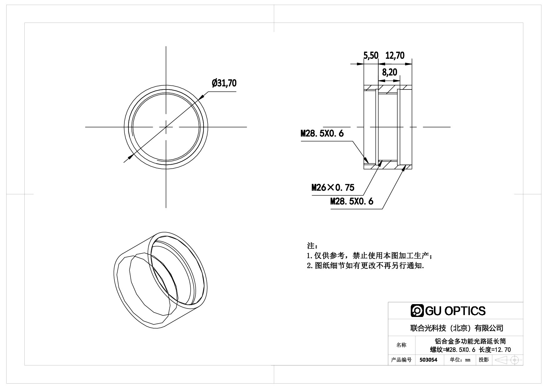 多功能光路延长筒(Multi Purpose Extension Tube)用于光路中,可以方便调整光学器件的空间间隔,配合调焦部件,更可以实现不同光学部件间隔的精密调整。联合光科技提供的多功能光路延长筒内部都有精密车制的标准螺纹,双端都有标准螺纹接口用于和光桥系统所有其他产品的互联。所有多功能光路延长筒内部都有精密车制的标准螺纹,同时双端都有标准螺纹接口用于和光桥系统所有其他产品的互连。 当多功能光路延长筒仅用于延长光路使用时,其内部精密螺纹结构起到消光作用,为光路中杂散光的消除提供了极大的帮助,同时也彻底排除了外界杂散光对光学系统的干扰。当多功能光路延长筒和安装压圈配合使用时,可以将各种标准口径的光学元件安装并固定在延长筒内部。这样为使用者提供了方便且经济的办法,用于镜头原型的设计及试验,或用于复杂光学系统的建立。
