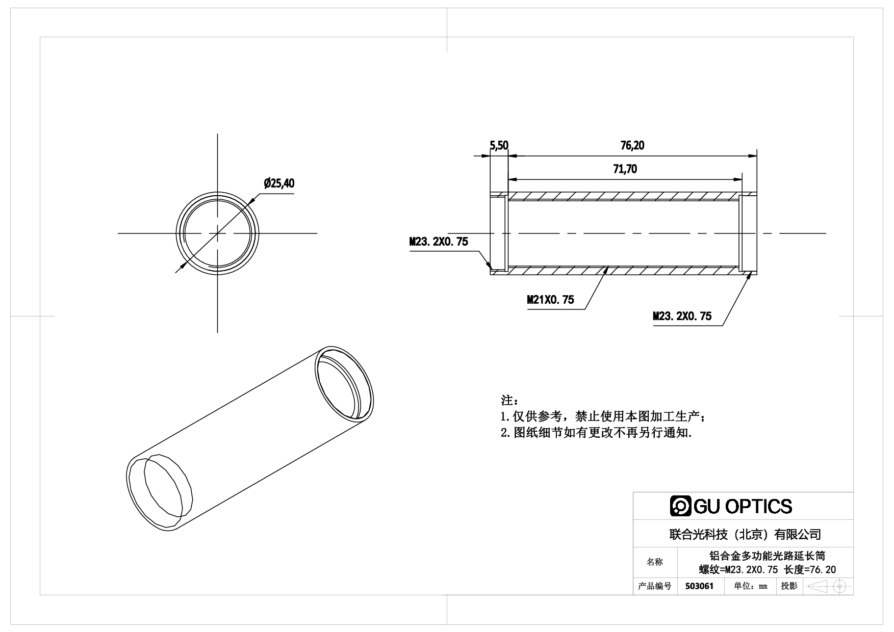 多功能光路延长筒(Multi Purpose Extension Tube)用于光路中,可以方便调整光学器件的空间间隔,配合调焦部件,更可以实现不同光学部件间隔的精密调整。联合光科技提供的多功能光路延长筒内部都有精密车制的标准螺纹,双端都有标准螺纹接口用于和光桥系统所有其他产品的互联。所有多功能光路延长筒内部都有精密车制的标准螺纹,同时双端都有标准螺纹接口用于和光桥系统所有其他产品的互连。 当多功能光路延长筒仅用于延长光路使用时,其内部精密螺纹结构起到消光作用,为光路中杂散光的消除提供了极大的帮助,同时也彻底排除了外界杂散光对光学系统的干扰。当多功能光路延长筒和安装压圈配合使用时,可以将各种标准口径的光学元件安装并固定在延长筒内部。这样为使用者提供了方便且经济的办法,用于镜头原型的设计及试验,或用于复杂光学系统的建立。
