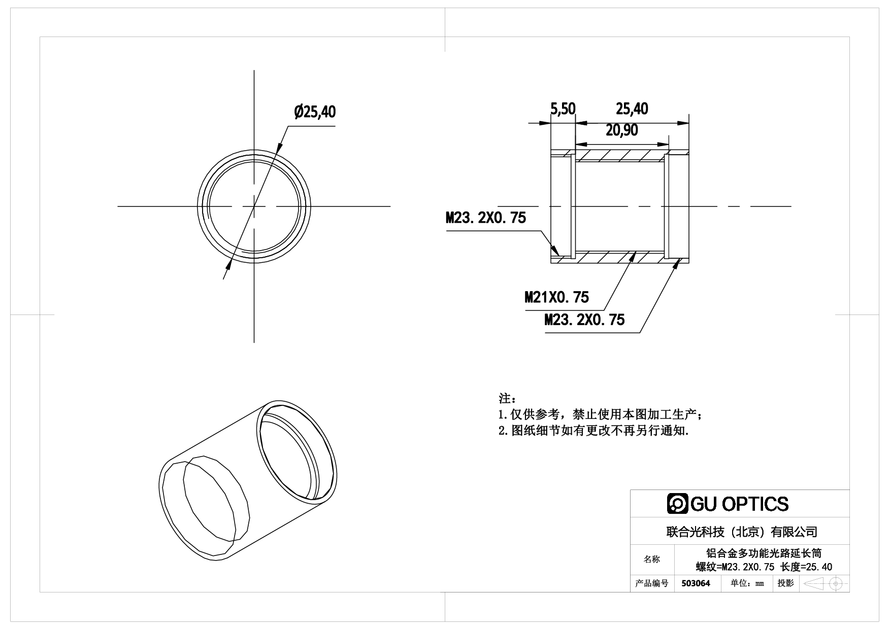 多功能光路延长筒(Multi Purpose Extension Tube)用于光路中,可以方便调整光学器件的空间间隔,配合调焦部件,更可以实现不同光学部件间隔的精密调整。联合光科技提供的多功能光路延长筒内部都有精密车制的标准螺纹,双端都有标准螺纹接口用于和光桥系统所有其他产品的互联。所有多功能光路延长筒内部都有精密车制的标准螺纹,同时双端都有标准螺纹接口用于和光桥系统所有其他产品的互连。 当多功能光路延长筒仅用于延长光路使用时,其内部精密螺纹结构起到消光作用,为光路中杂散光的消除提供了极大的帮助,同时也彻底排除了外界杂散光对光学系统的干扰。当多功能光路延长筒和安装压圈配合使用时,可以将各种标准口径的光学元件安装并固定在延长筒内部。这样为使用者提供了方便且经济的办法,用于镜头原型的设计及试验,或用于复杂光学系统的建立。