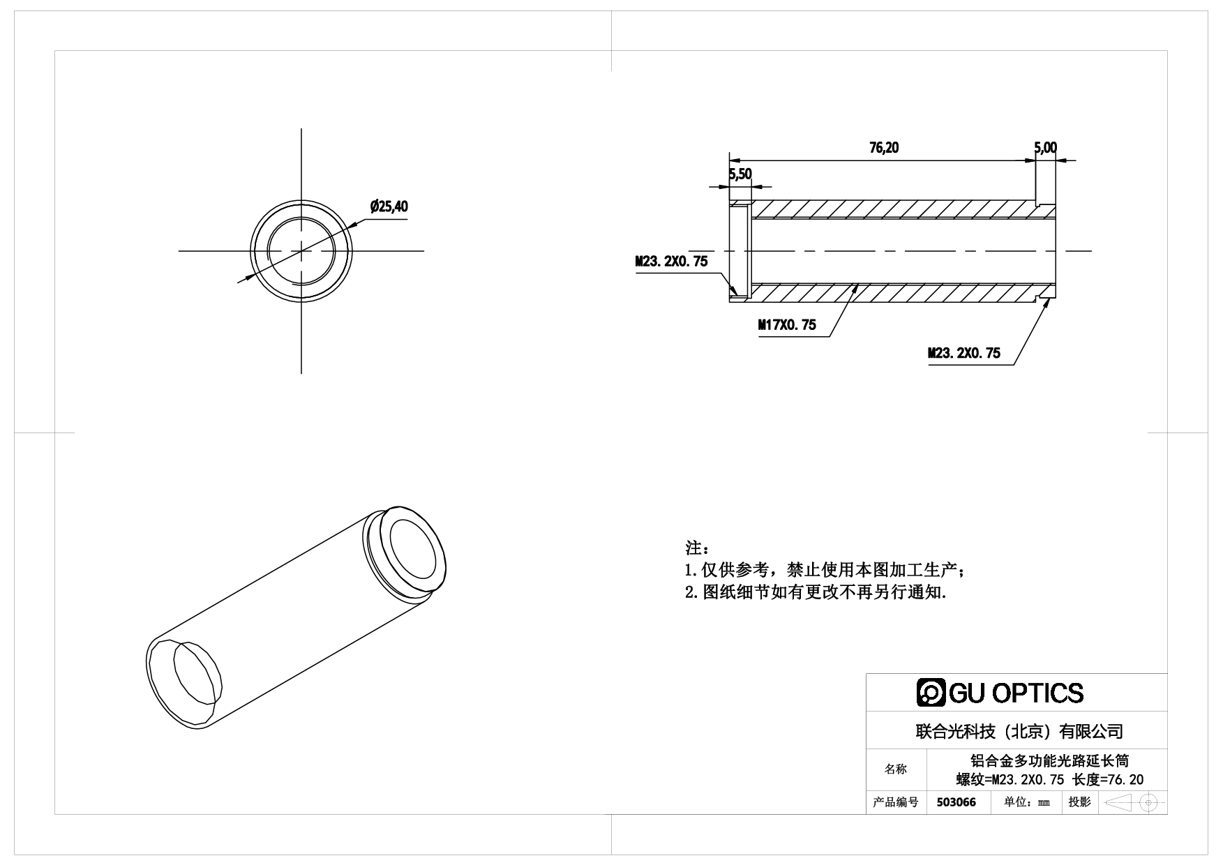 多功能光路延长筒(Multi Purpose Extension Tube)用于光路中,可以方便调整光学器件的空间间隔,配合调焦部件,更可以实现不同光学部件间隔的精密调整。联合光科技提供的多功能光路延长筒内部都有精密车制的标准螺纹,双端都有标准螺纹接口用于和光桥系统所有其他产品的互联。所有多功能光路延长筒内部都有精密车制的标准螺纹,同时双端都有标准螺纹接口用于和光桥系统所有其他产品的互连。 当多功能光路延长筒仅用于延长光路使用时,其内部精密螺纹结构起到消光作用,为光路中杂散光的消除提供了极大的帮助,同时也彻底排除了外界杂散光对光学系统的干扰。当多功能光路延长筒和安装压圈配合使用时,可以将各种标准口径的光学元件安装并固定在延长筒内部。这样为使用者提供了方便且经济的办法,用于镜头原型的设计及试验,或用于复杂光学系统的建立。