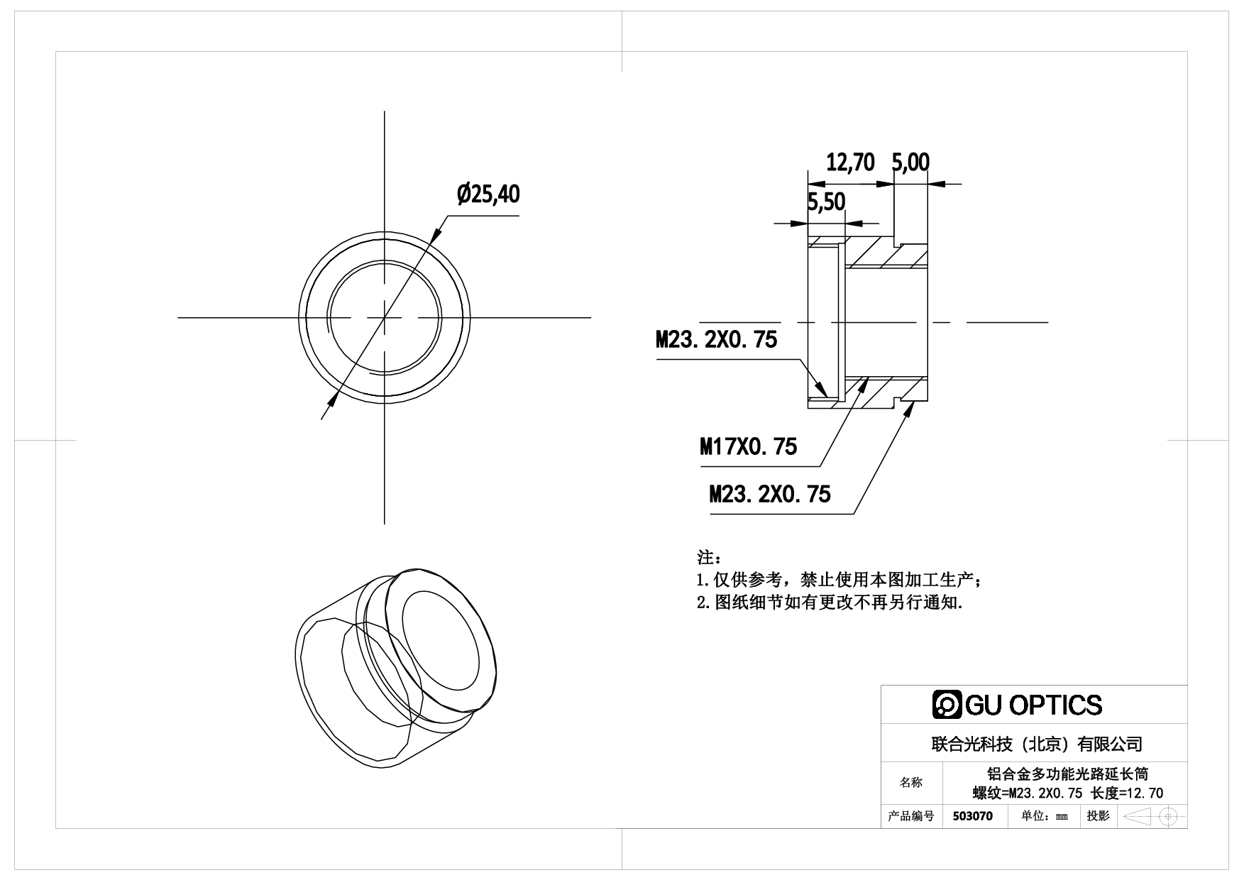 多功能光路延长筒(Multi Purpose Extension Tube)用于光路中,可以方便调整光学器件的空间间隔,配合调焦部件,更可以实现不同光学部件间隔的精密调整。联合光科技提供的多功能光路延长筒内部都有精密车制的标准螺纹,双端都有标准螺纹接口用于和光桥系统所有其他产品的互联。所有多功能光路延长筒内部都有精密车制的标准螺纹,同时双端都有标准螺纹接口用于和光桥系统所有其他产品的互连。 当多功能光路延长筒仅用于延长光路使用时,其内部精密螺纹结构起到消光作用,为光路中杂散光的消除提供了极大的帮助,同时也彻底排除了外界杂散光对光学系统的干扰。当多功能光路延长筒和安装压圈配合使用时,可以将各种标准口径的光学元件安装并固定在延长筒内部。这样为使用者提供了方便且经济的办法,用于镜头原型的设计及试验,或用于复杂光学系统的建立。