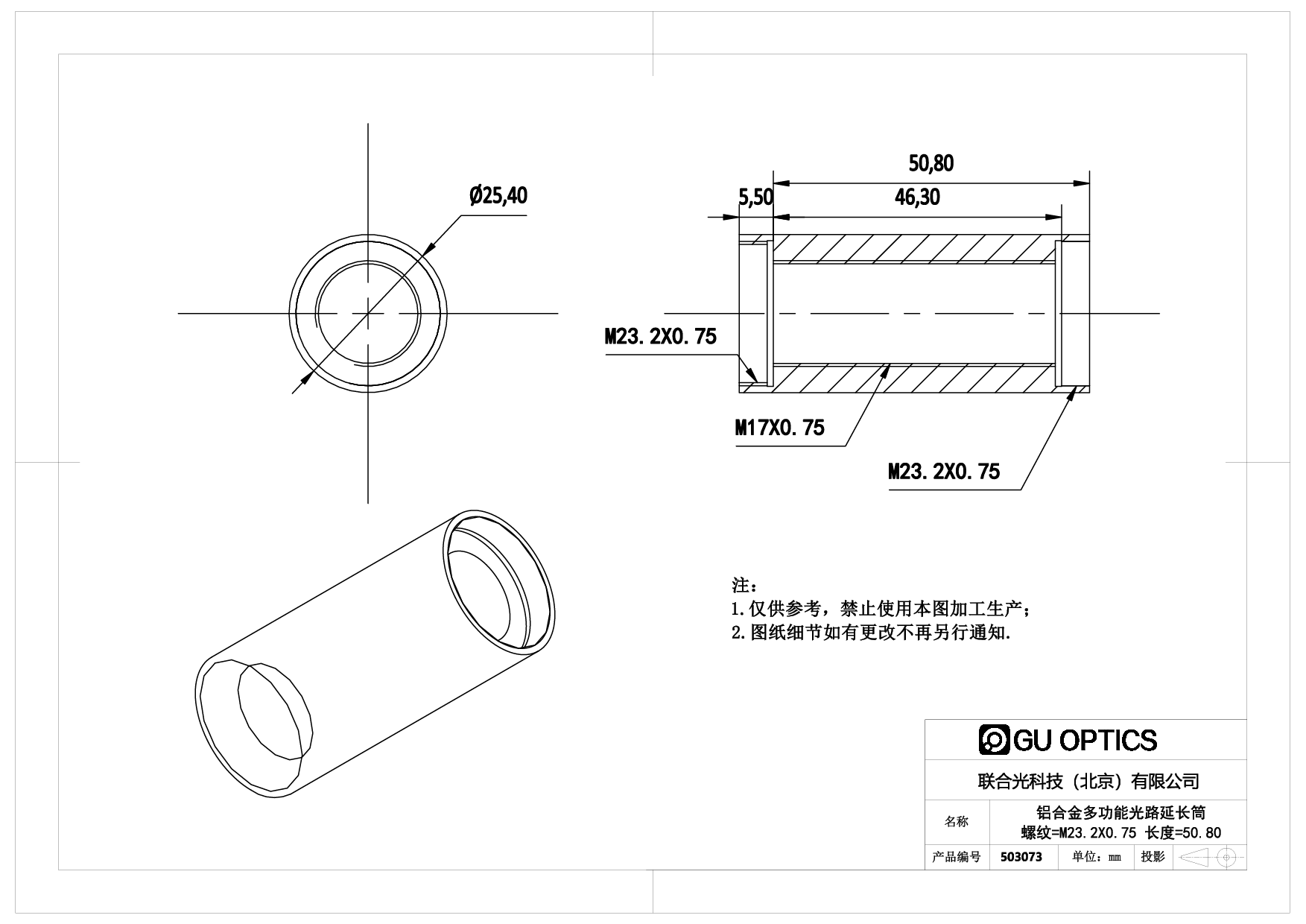 多功能光路延长筒(Multi Purpose Extension Tube)用于光路中,可以方便调整光学器件的空间间隔,配合调焦部件,更可以实现不同光学部件间隔的精密调整。联合光科技提供的多功能光路延长筒内部都有精密车制的标准螺纹,双端都有标准螺纹接口用于和光桥系统所有其他产品的互联。所有多功能光路延长筒内部都有精密车制的标准螺纹,同时双端都有标准螺纹接口用于和光桥系统所有其他产品的互连。 当多功能光路延长筒仅用于延长光路使用时,其内部精密螺纹结构起到消光作用,为光路中杂散光的消除提供了极大的帮助,同时也彻底排除了外界杂散光对光学系统的干扰。当多功能光路延长筒和安装压圈配合使用时,可以将各种标准口径的光学元件安装并固定在延长筒内部。这样为使用者提供了方便且经济的办法,用于镜头原型的设计及试验,或用于复杂光学系统的建立。