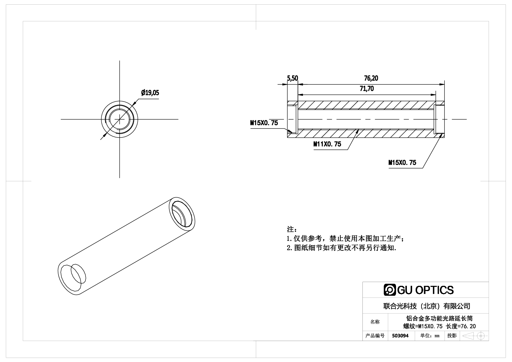 多功能光路延长筒(Multi Purpose Extension Tube)用于光路中,可以方便调整光学器件的空间间隔,配合调焦部件,更可以实现不同光学部件间隔的精密调整。联合光科技提供的多功能光路延长筒内部都有精密车制的标准螺纹,双端都有标准螺纹接口用于和光桥系统所有其他产品的互联。所有多功能光路延长筒内部都有精密车制的标准螺纹,同时双端都有标准螺纹接口用于和光桥系统所有其他产品的互连。 当多功能光路延长筒仅用于延长光路使用时,其内部精密螺纹结构起到消光作用,为光路中杂散光的消除提供了极大的帮助,同时也彻底排除了外界杂散光对光学系统的干扰。当多功能光路延长筒和安装压圈配合使用时,可以将各种标准口径的光学元件安装并固定在延长筒内部。这样为使用者提供了方便且经济的办法,用于镜头原型的设计及试验,或用于复杂光学系统的建立。