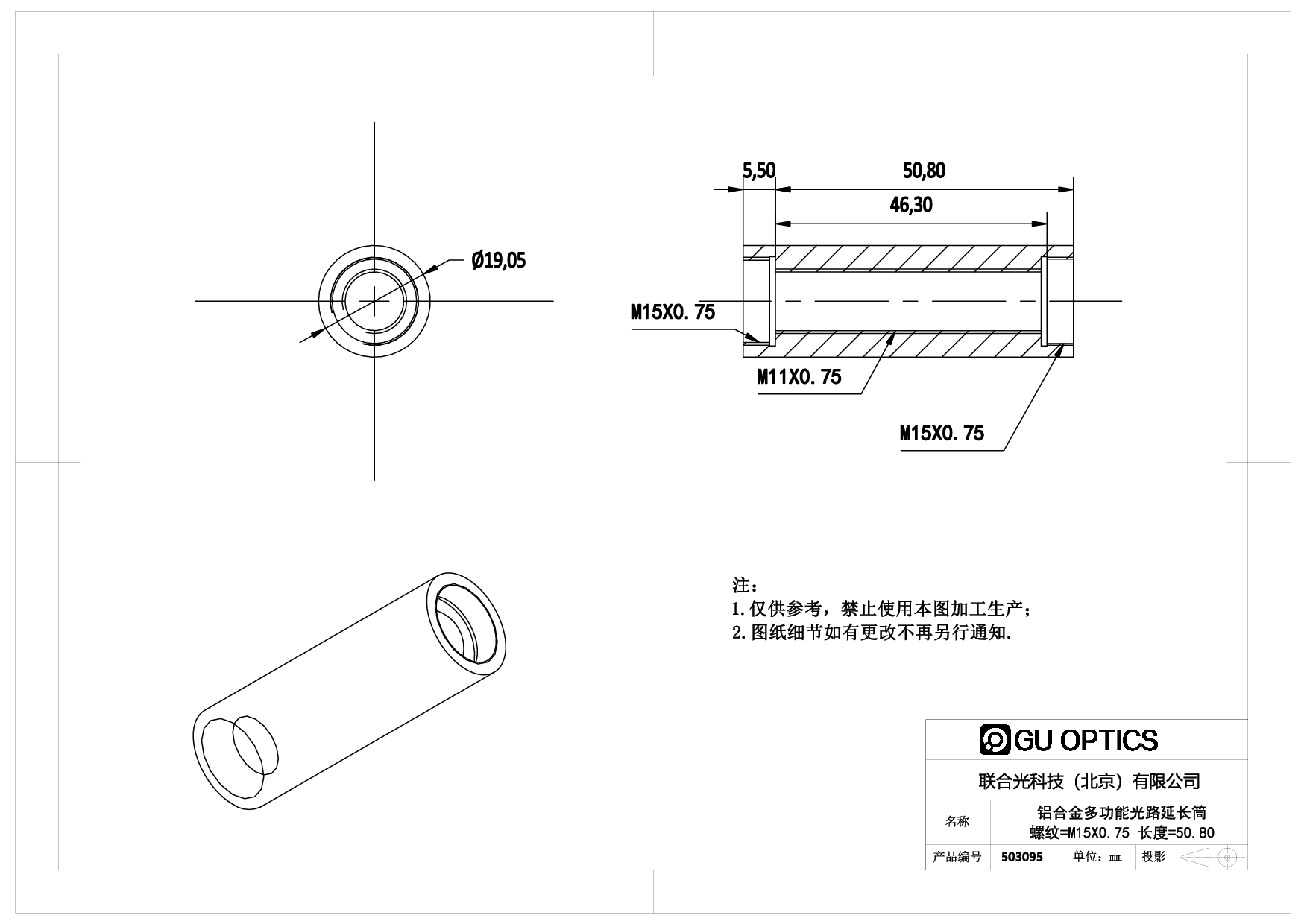 多功能光路延长筒(Multi Purpose Extension Tube)用于光路中,可以方便调整光学器件的空间间隔,配合调焦部件,更可以实现不同光学部件间隔的精密调整。联合光科技提供的多功能光路延长筒内部都有精密车制的标准螺纹,双端都有标准螺纹接口用于和光桥系统所有其他产品的互联。所有多功能光路延长筒内部都有精密车制的标准螺纹,同时双端都有标准螺纹接口用于和光桥系统所有其他产品的互连。 当多功能光路延长筒仅用于延长光路使用时,其内部精密螺纹结构起到消光作用,为光路中杂散光的消除提供了极大的帮助,同时也彻底排除了外界杂散光对光学系统的干扰。当多功能光路延长筒和安装压圈配合使用时,可以将各种标准口径的光学元件安装并固定在延长筒内部。这样为使用者提供了方便且经济的办法,用于镜头原型的设计及试验,或用于复杂光学系统的建立。