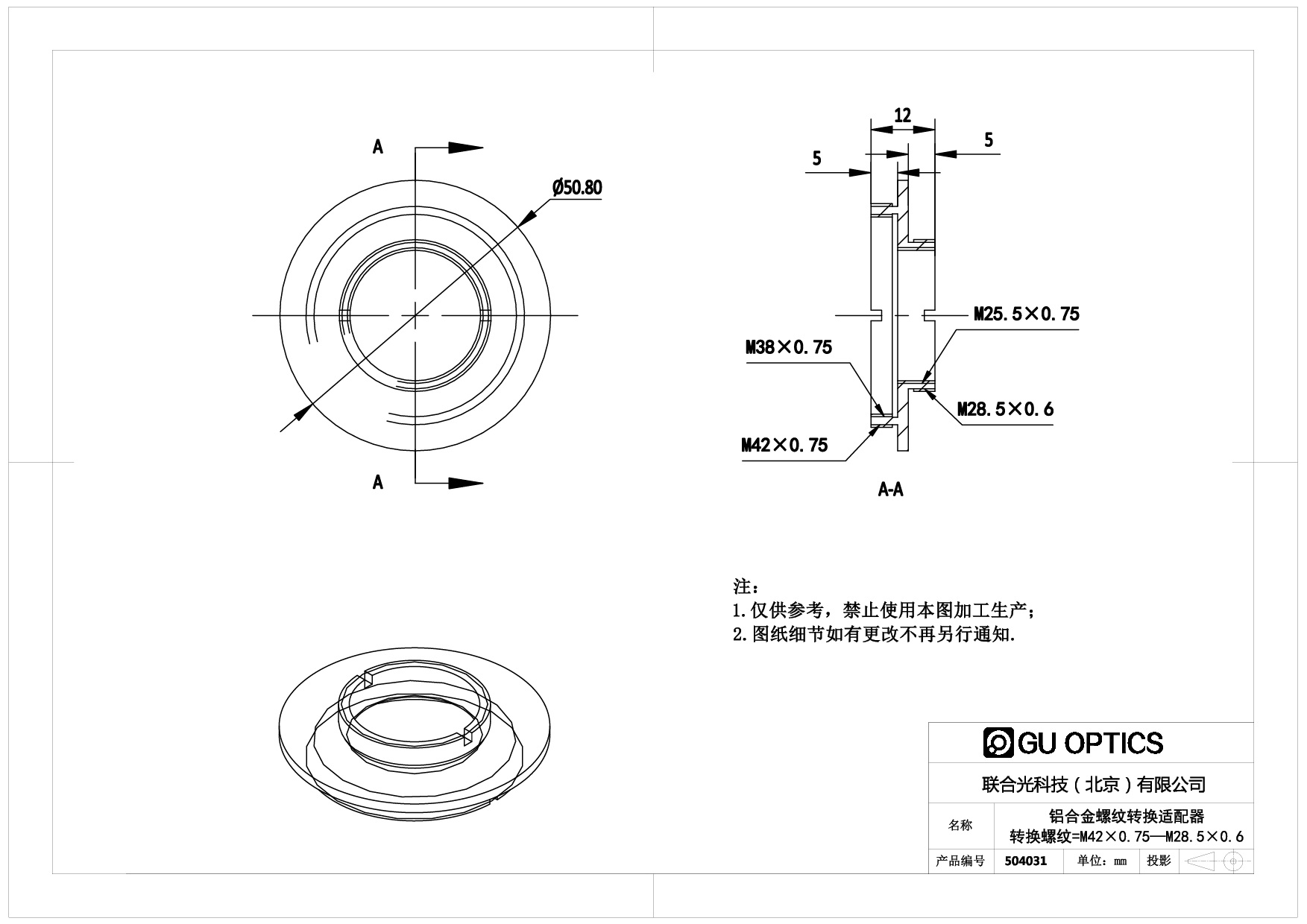 所有螺纹转换适配器都采用精密CNC数控加工,具有极高的尺寸精度以及良好的同心度和一致性,可使不同部件相互连接后的整体光路同轴。螺纹转换器还提供了和其他通用品牌的实验室光机部件之间的螺纹转换适配器(光桥系统和SM1、SM2、SM05匹配连接的螺纹转换接口等)。用户可以方便的将光桥系列产品应用到已经使用的光学架构系统中,从而节省从国内外采购同类产品的昂贵成本。