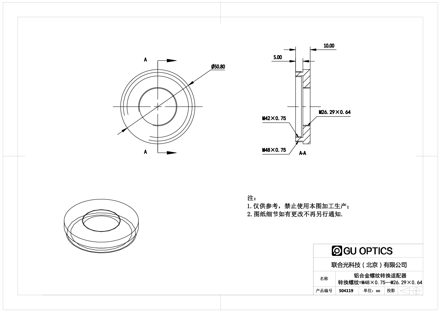 所有螺纹转换适配器都采用精密CNC数控加工,具有极高的尺寸精度以及良好的同心度和一致性,可使不同部件相互连接后的整体光路同轴。螺纹转换器还提供了和其他通用品牌的实验室光机部件之间的螺纹转换适配器(光桥系统和SM1、SM2、SM05匹配连接的螺纹转换接口等)。用户可以方便的将光桥系列产品应用到已经使用的光学架构系统中,从而节省从国内外采购同类产品的昂贵成本。