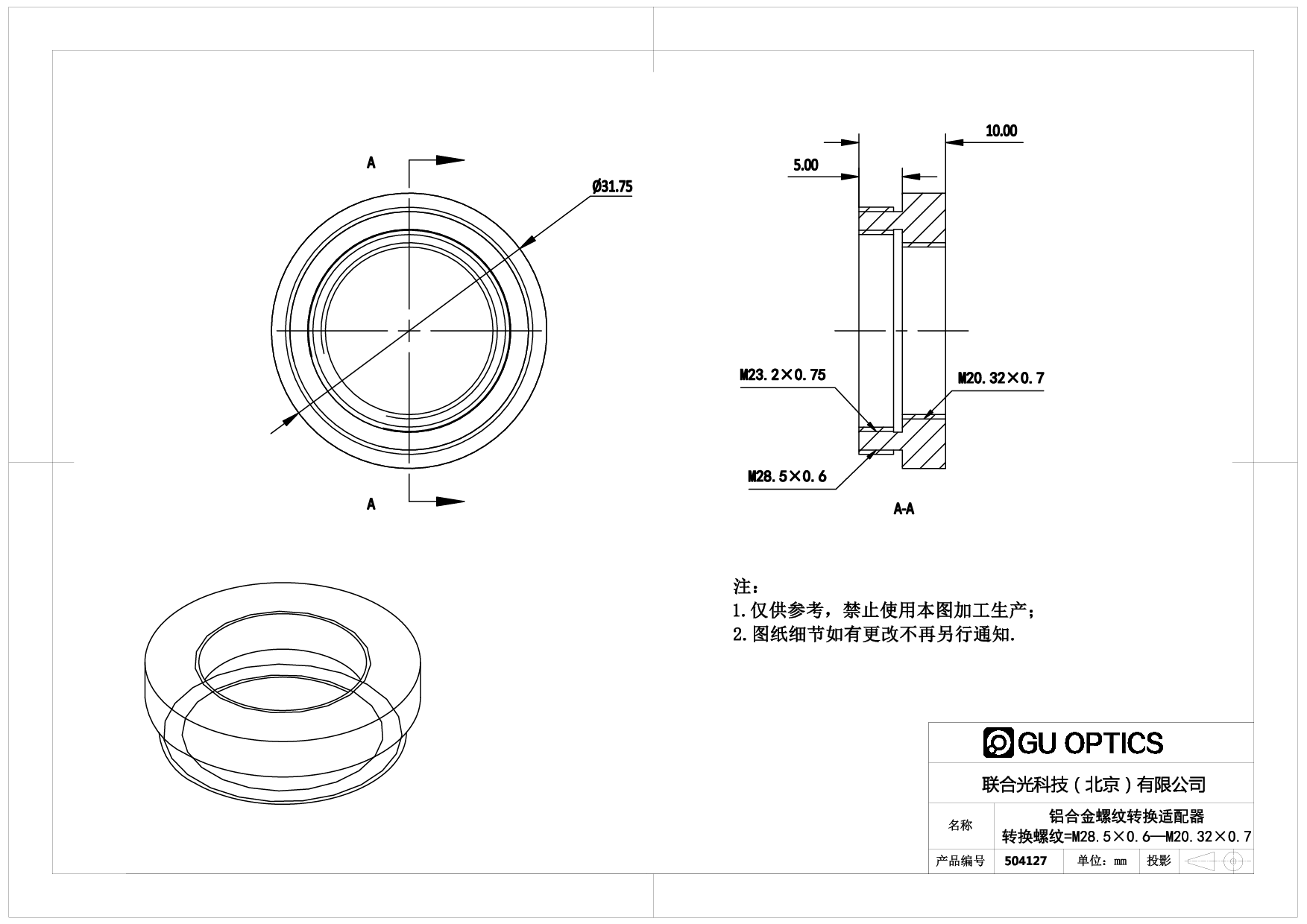 所有螺纹转换适配器都采用精密CNC数控加工,具有极高的尺寸精度以及良好的同心度和一致性,可使不同部件相互连接后的整体光路同轴。螺纹转换器还提供了和其他通用品牌的实验室光机部件之间的螺纹转换适配器(光桥系统和SM1、SM2、SM05匹配连接的螺纹转换接口等)。用户可以方便的将光桥系列产品应用到已经使用的光学架构系统中,从而节省从国内外采购同类产品的昂贵成本。