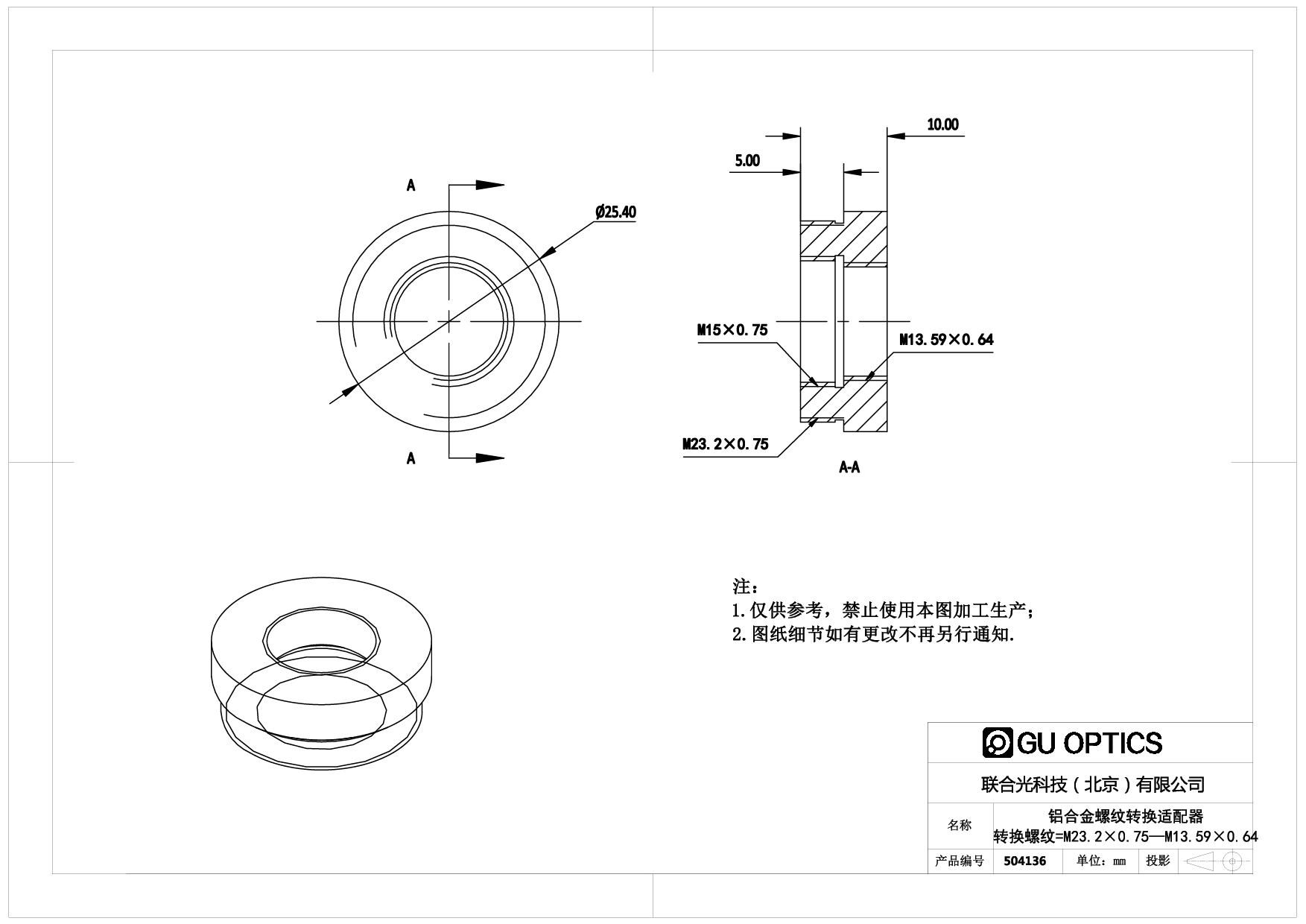 所有螺纹转换适配器都采用精密CNC数控加工,具有极高的尺寸精度以及良好的同心度和一致性,可使不同部件相互连接后的整体光路同轴。螺纹转换器还提供了和其他通用品牌的实验室光机部件之间的螺纹转换适配器(光桥系统和SM1、SM2、SM05匹配连接的螺纹转换接口等)。用户可以方便的将光桥系列产品应用到已经使用的光学架构系统中,从而节省从国内外采购同类产品的昂贵成本。