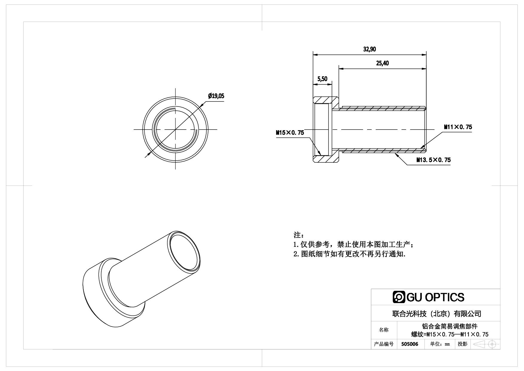 简易调焦部件 Ø19.05mm 调节行程=12.5mm