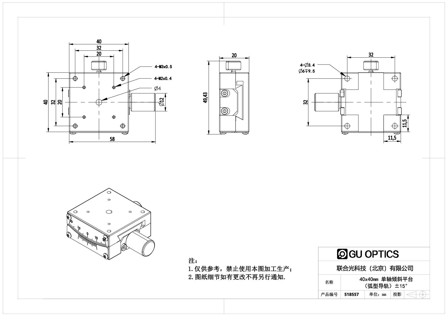 40x40mm 单轴倾斜平台(铜合金燕尾式)±15°