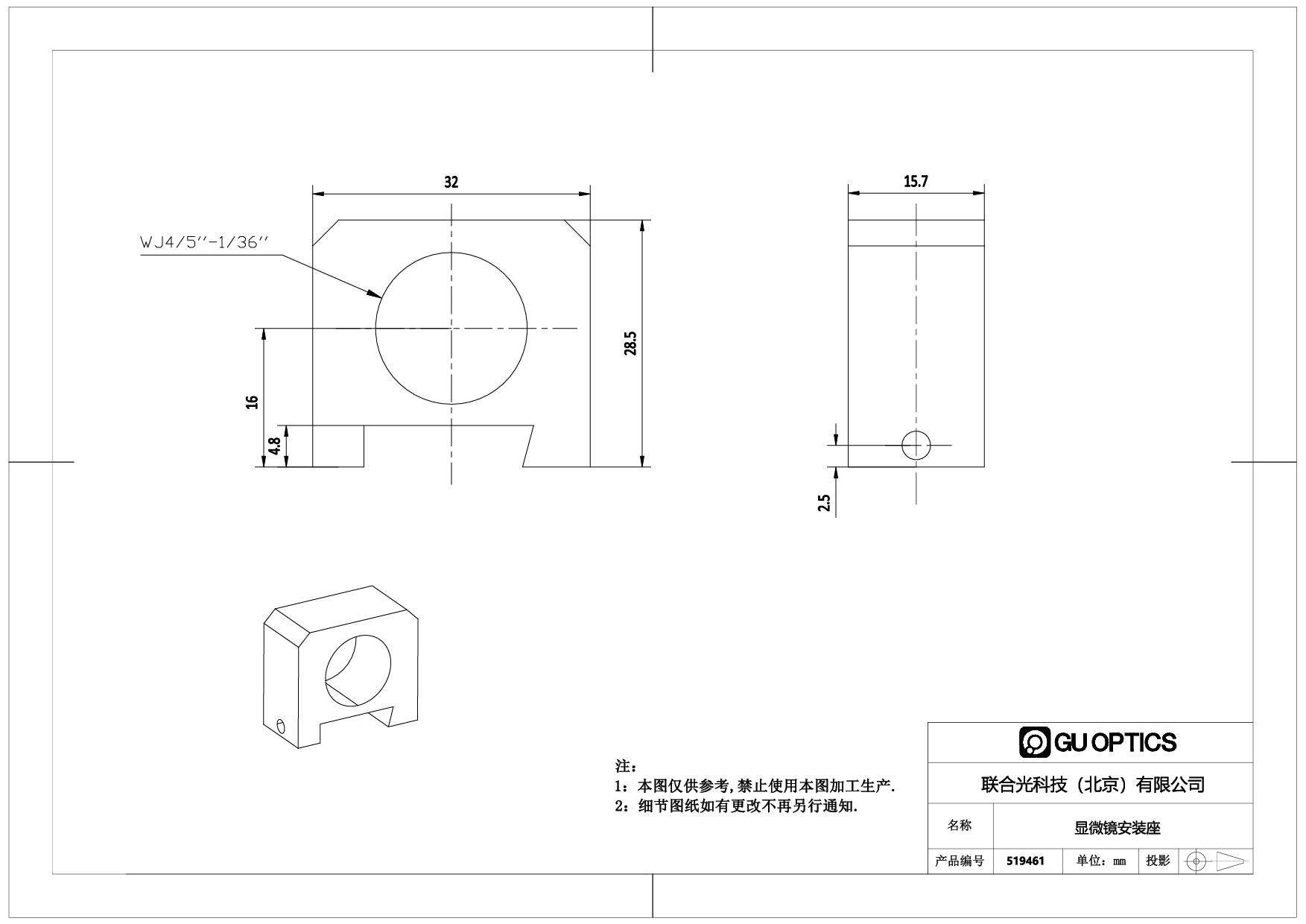 可固定标准显微镜(W4/5"-1/36"),底部燕尾座可直接固定在燕尾槽上,侧面带顶丝,方便拆卸。