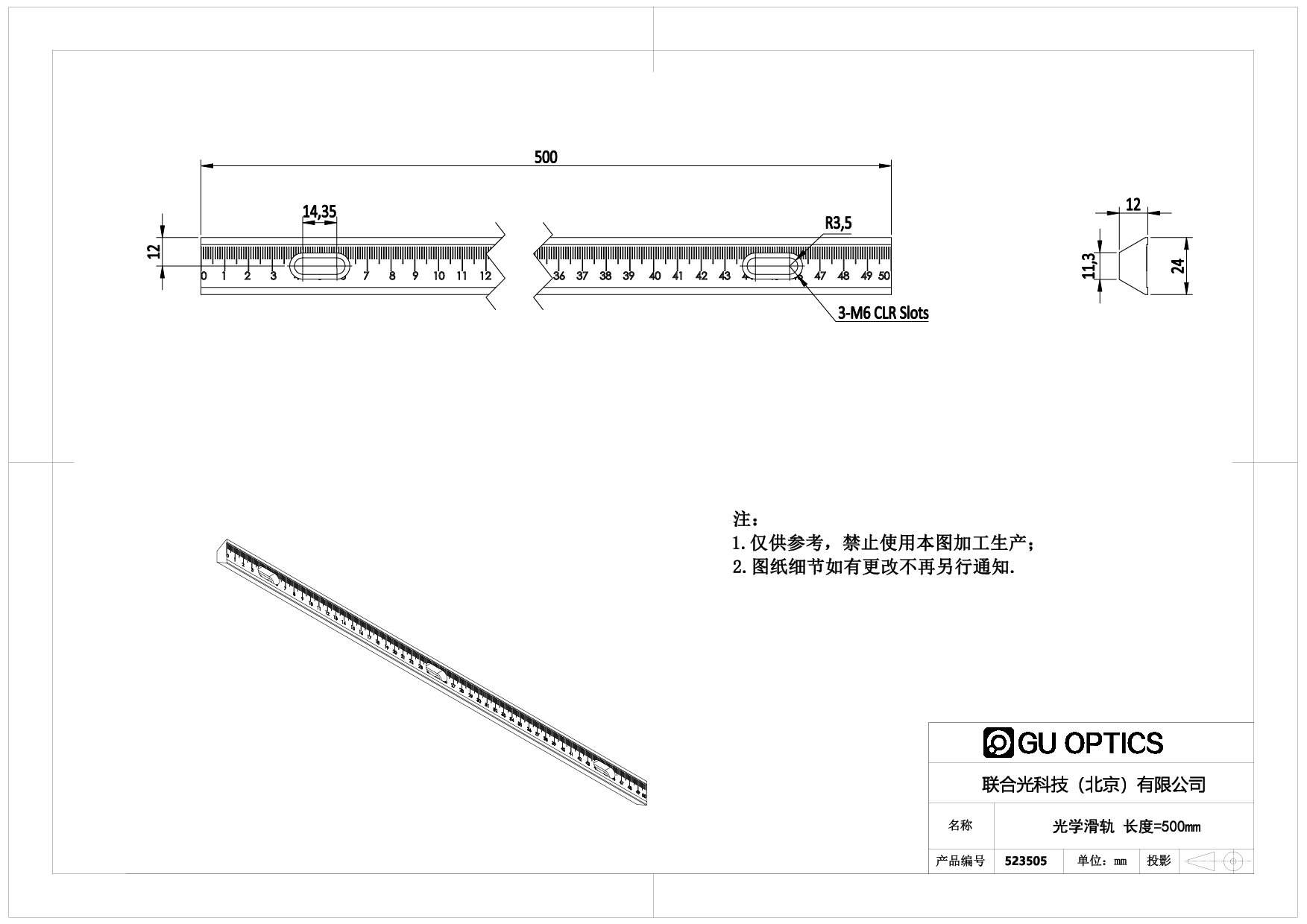 光学滑轨(Optical Rail)适用于搭建高稳定性及刚性的实验室系统的,配合卡入式光学滑块,安装的光学元件及机械元件可沿着导轨直线滑动。1 mm刻线精度,每10 mm带刻度数字标识用于精确定位。带多个腰型槽及M6沉头孔,可灵活安装在面包板或光学平台上。 导轨有宽度有24mm,50.8mm可选,长度从200-1000mm可供选择。