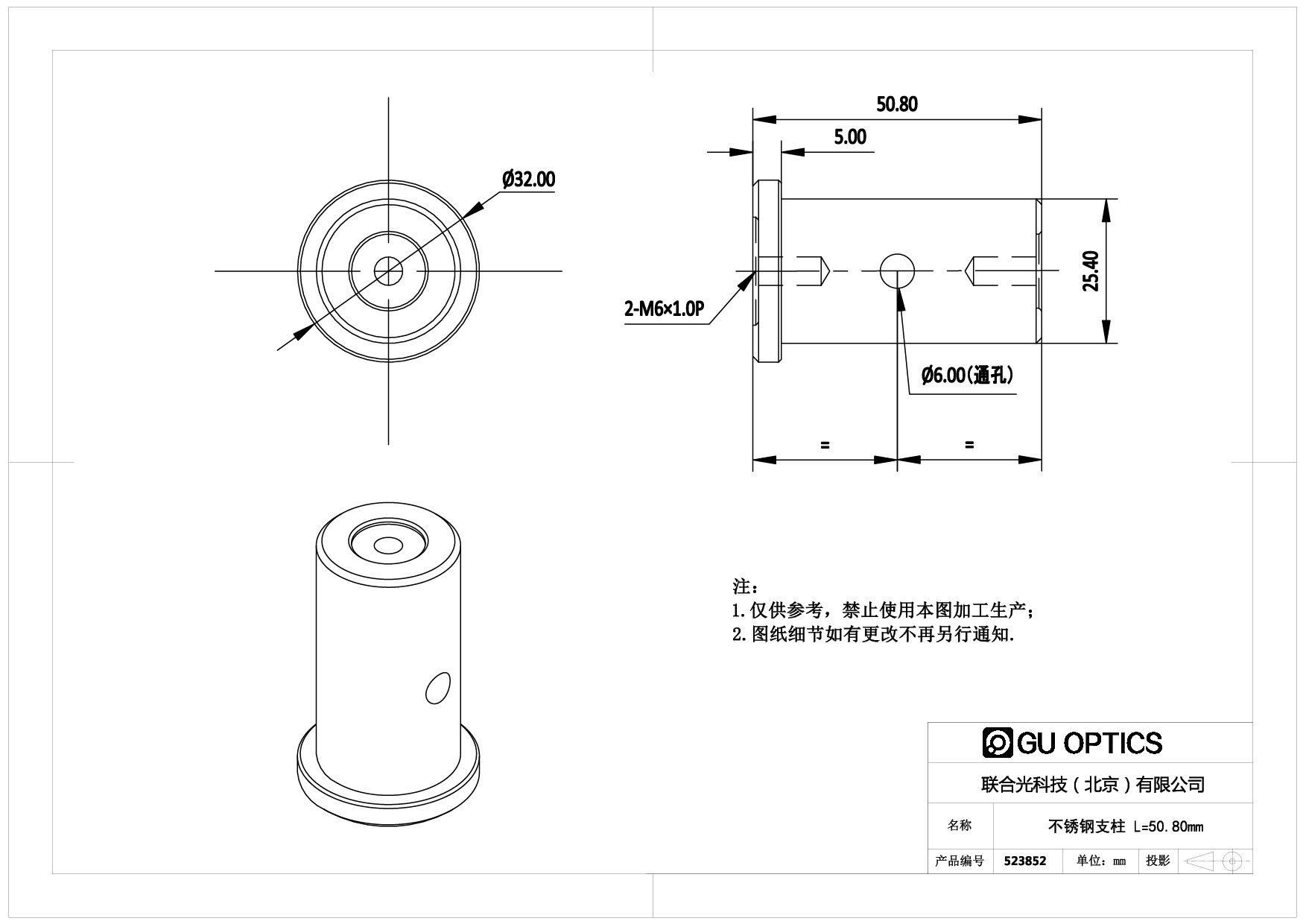 固定高度的基座(Fixed Height Pedestal)有较大的直径和较强钢性。比传统支撑棒/支撑座组合有更好的稳定性。高度基座的两端有不同的螺纹牙孔,使固定时能有更多的弹性上端和底端都有M6螺纹牙孔,侧边提供一穿孔,方便客户用六角板手穿过此孔锁紧光学组件。有六种不同的高度25.4mm~127mm可供选择,其它高度可依顾客要求订做。