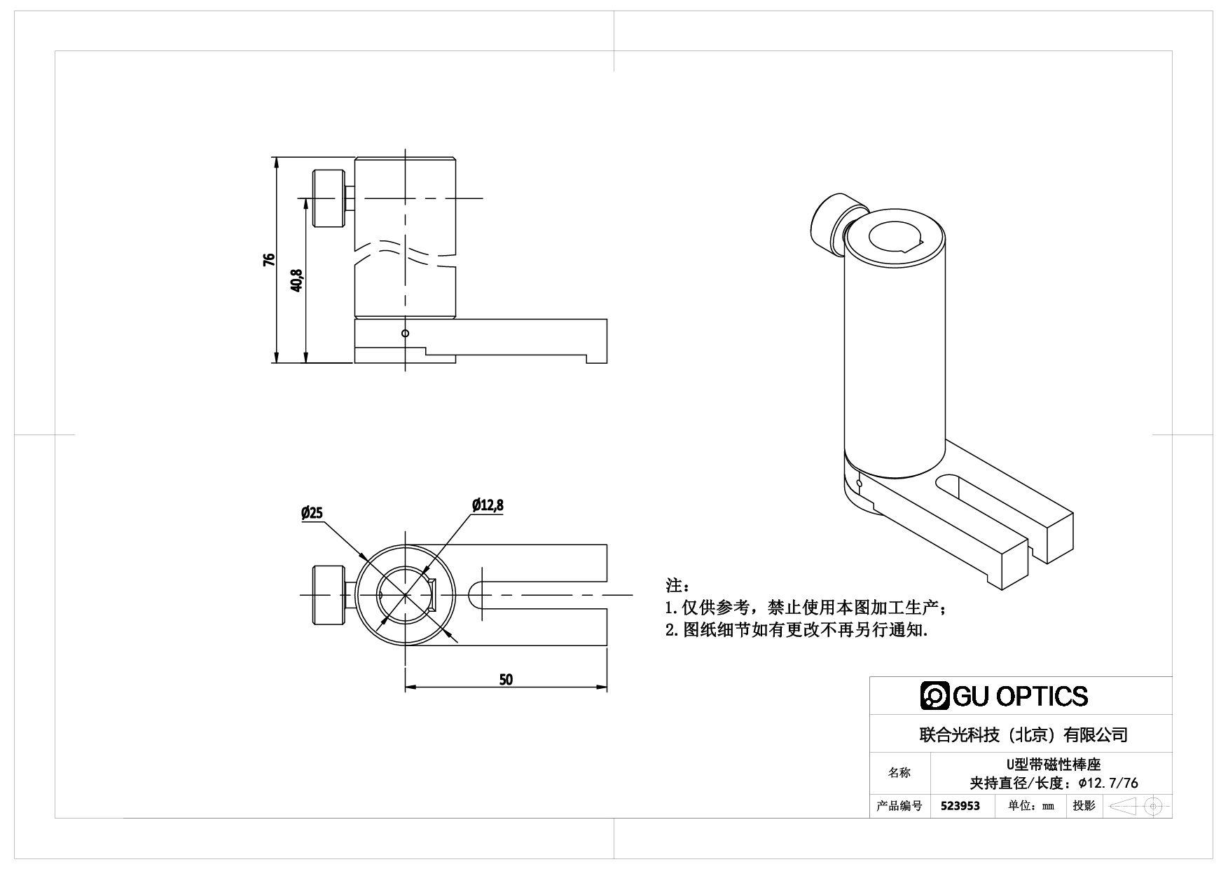 U型带磁性棒座(U Type Magnetic Base Post Holder)的底座360度旋转方便安装 底座的磁铁在固定到光学平台前提供夹持力 联合光科提供六种长度25.4mm~127mm供您选择。