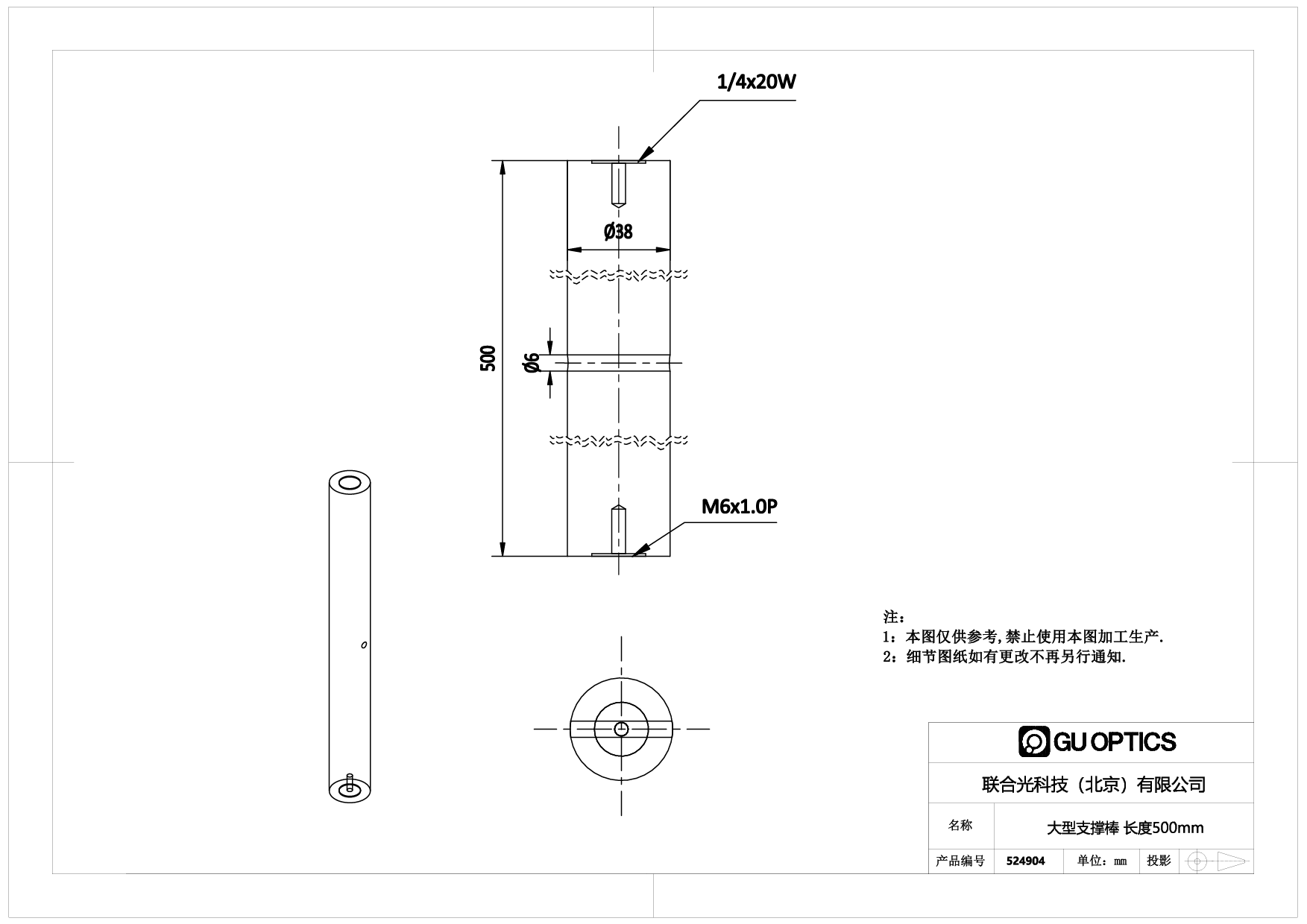 联合光科的大型支撑棒直径38mm,不同长度的支撑棒供您选择:75mm-600mm。支撑棒两端带有M6螺纹孔,可以方便的将不同长度的支撑棒交叉组合使用,可以达到您理想的高度。大型支撑棒可以与大型支撑棒基座配合使用,可以方便快捷的固定在光学平台上,也可以与大型支撑棒夹持器搭配使用,方便简洁,提供光学安装面。联合光科可为您提供配套的光机元件,同时我们有大量的标准库现货供应。联合光科衷心期望在您构建光学实验系统的过程中,能为您提供简洁、经济、快捷的手段,并方便您使用过程中快捷的进行元件替换和调整。